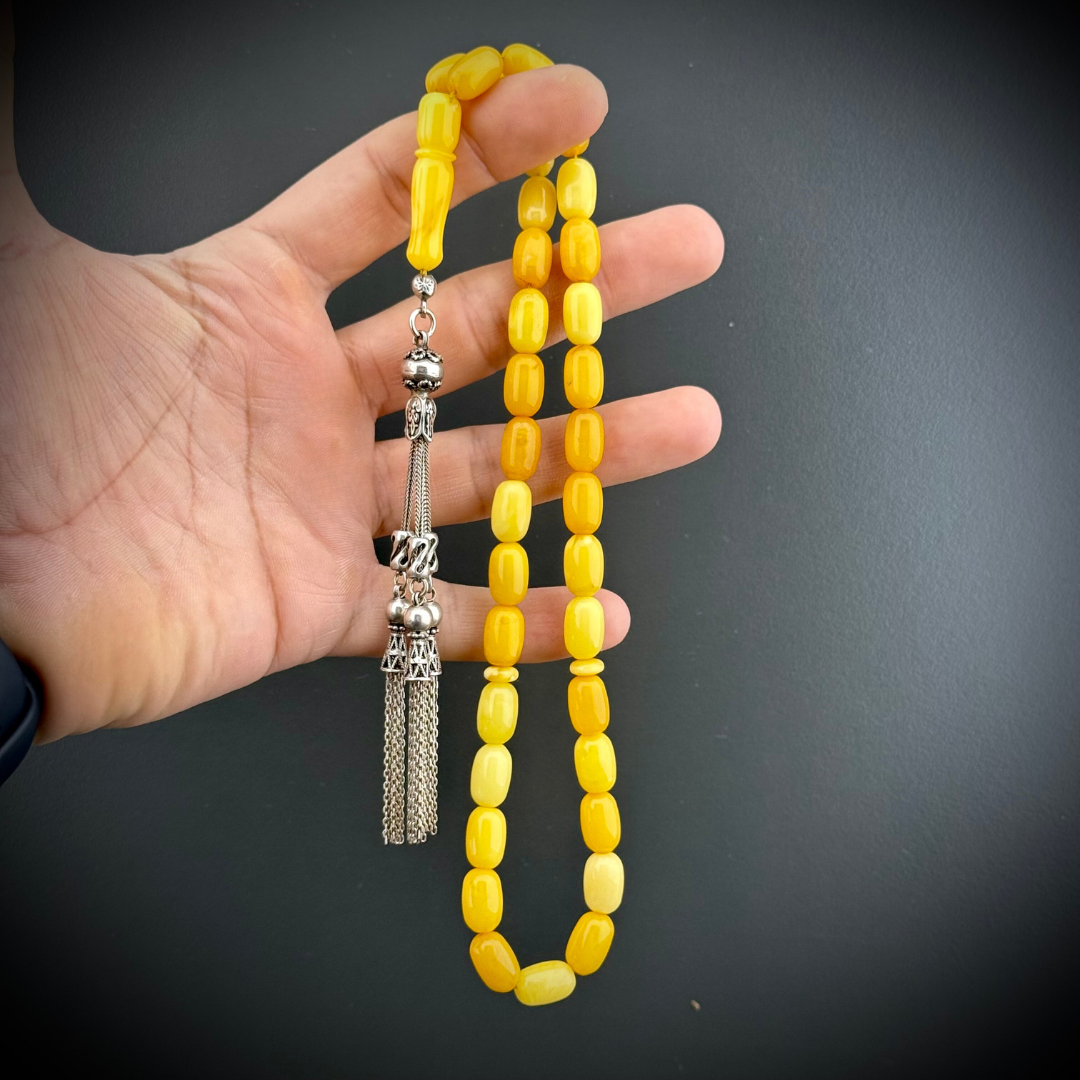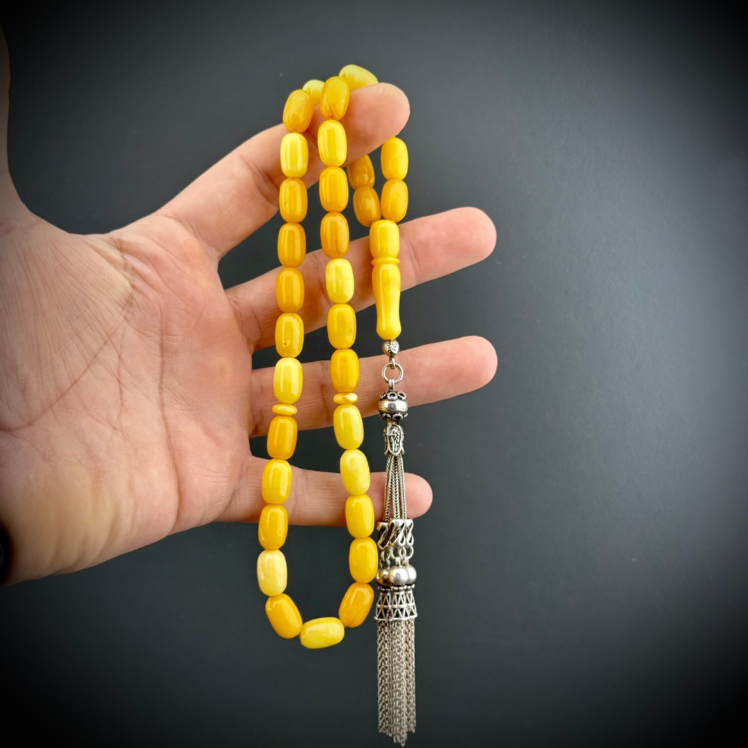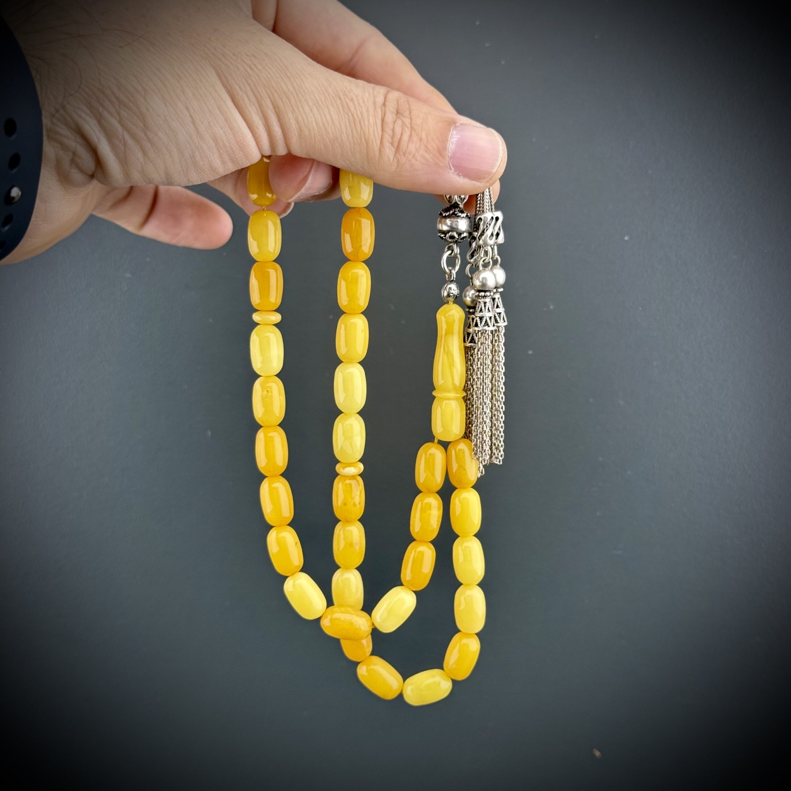 Sarı renginin ışıltısıyla göz dolduran bu özel tesbih, Rus Kaliningrad damla kehribarının eşsiz doğallığını yansıtıyor. 8x13mm ölçülerinde kapsül kesimiyle zarafeti ve rahat çekimi bir araya getiriyor. Kalitesini ve estetiğini bir arada sunan bu tesbih, koleksiyon tutkunlarının gözdesi olmaya aday.