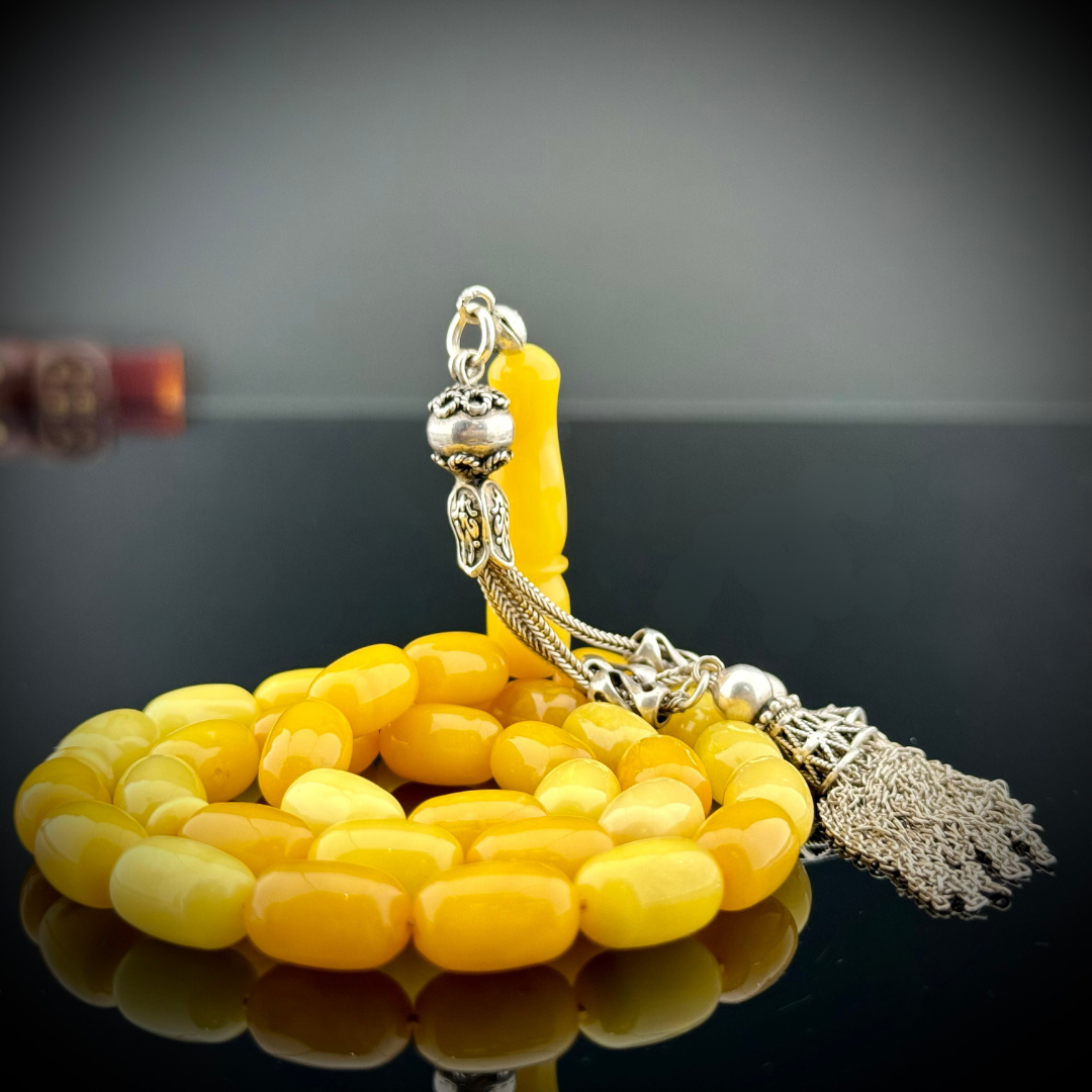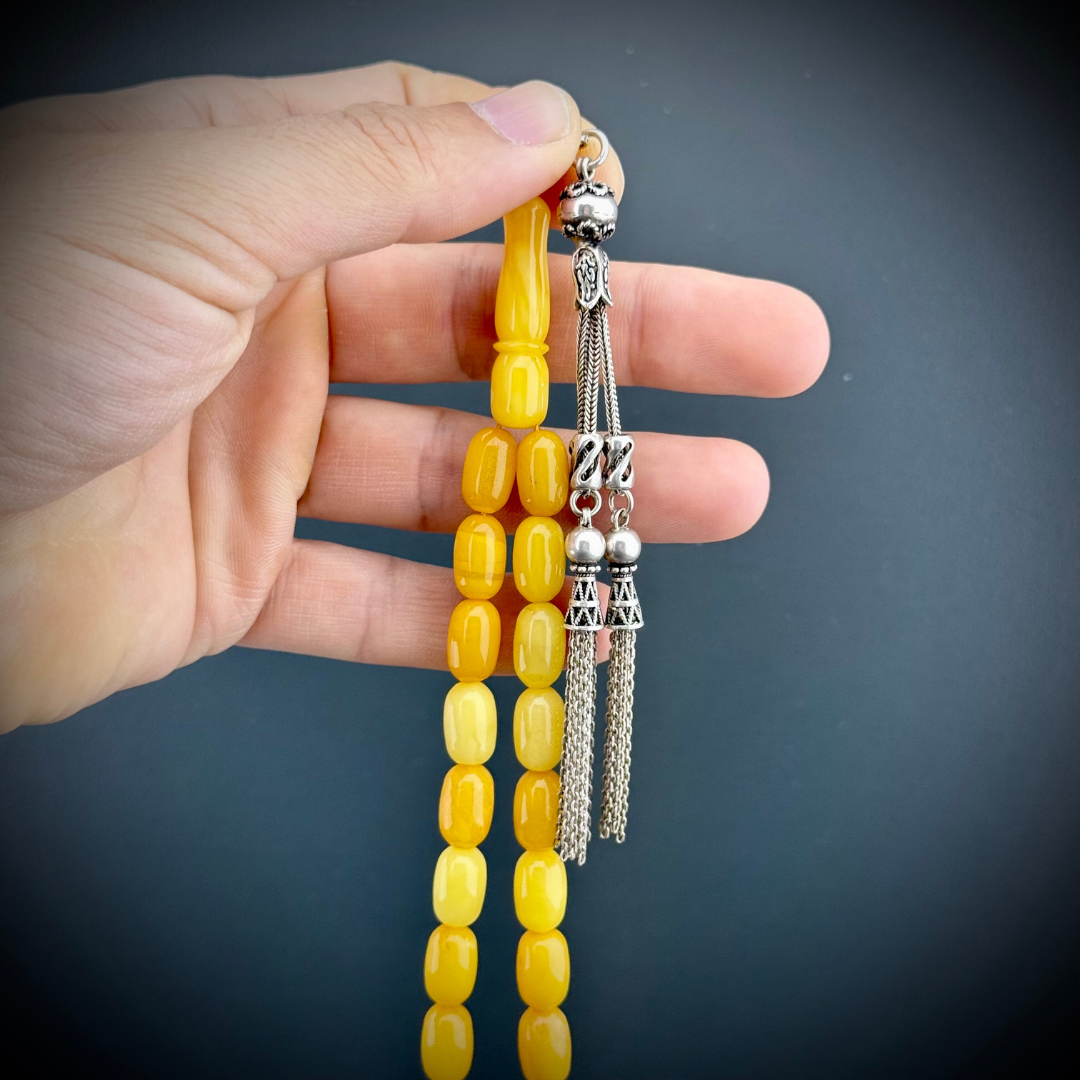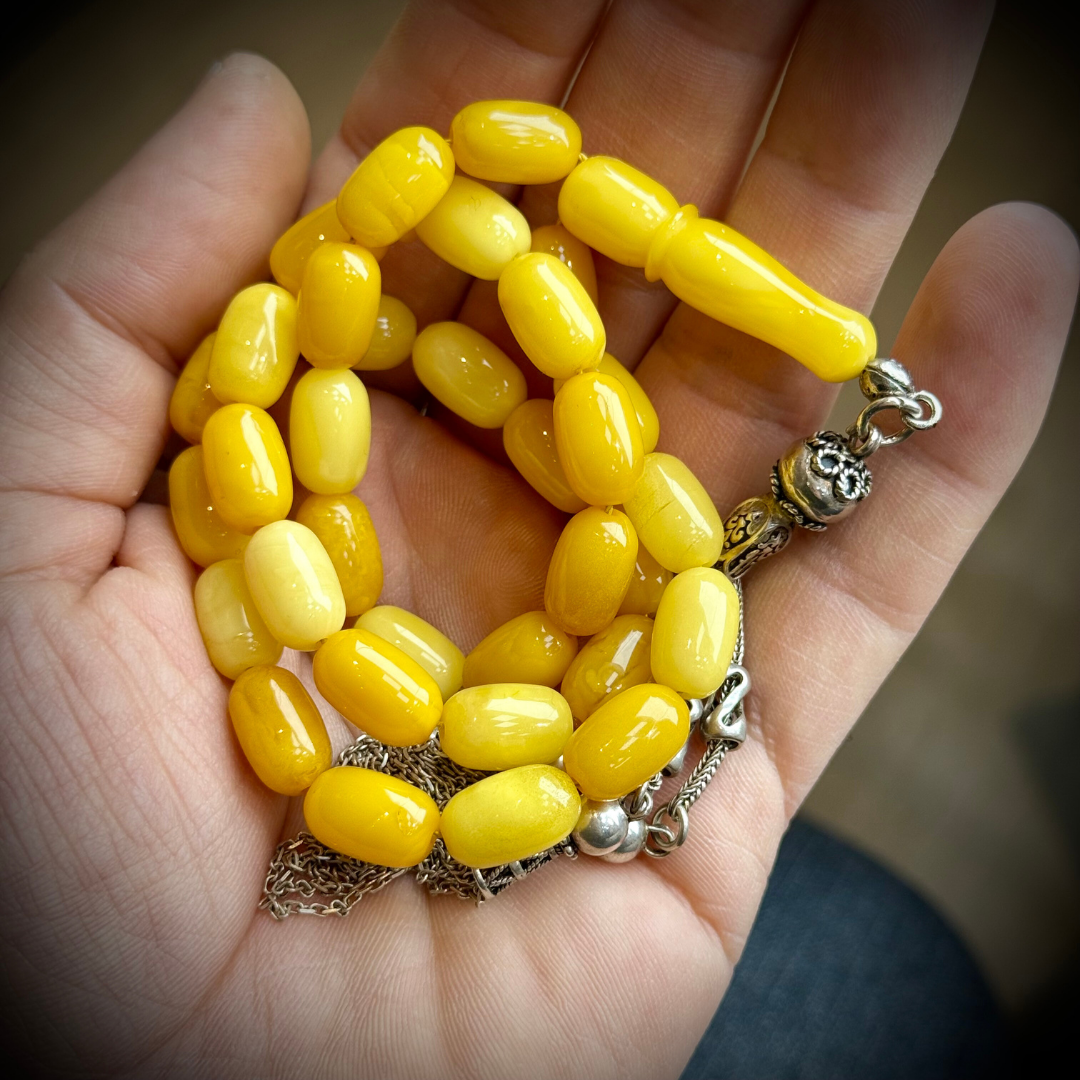 Sarı renginin ışıltısıyla göz dolduran bu özel tesbih, Rus Kaliningrad damla kehribarının eşsiz doğallığını yansıtıyor. 8x13mm ölçülerinde kapsül kesimiyle zarafeti ve rahat çekimi bir araya getiriyor. Kalitesini ve estetiğini bir arada sunan bu tesbih, koleksiyon tutkunlarının gözdesi olmaya aday.