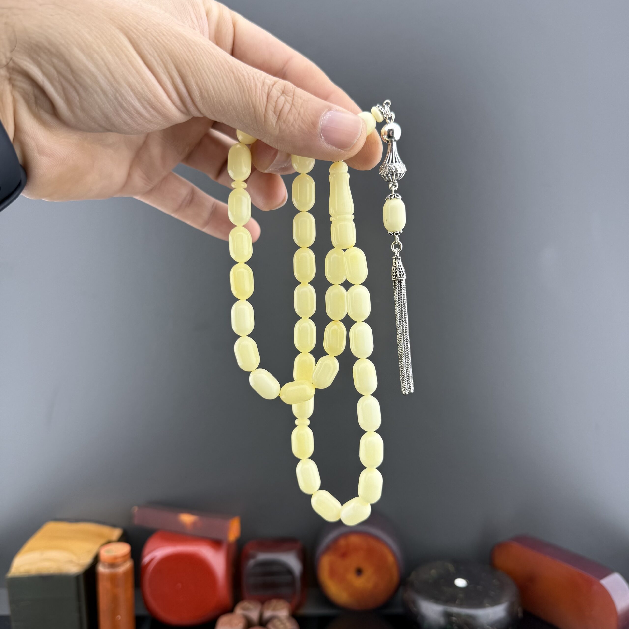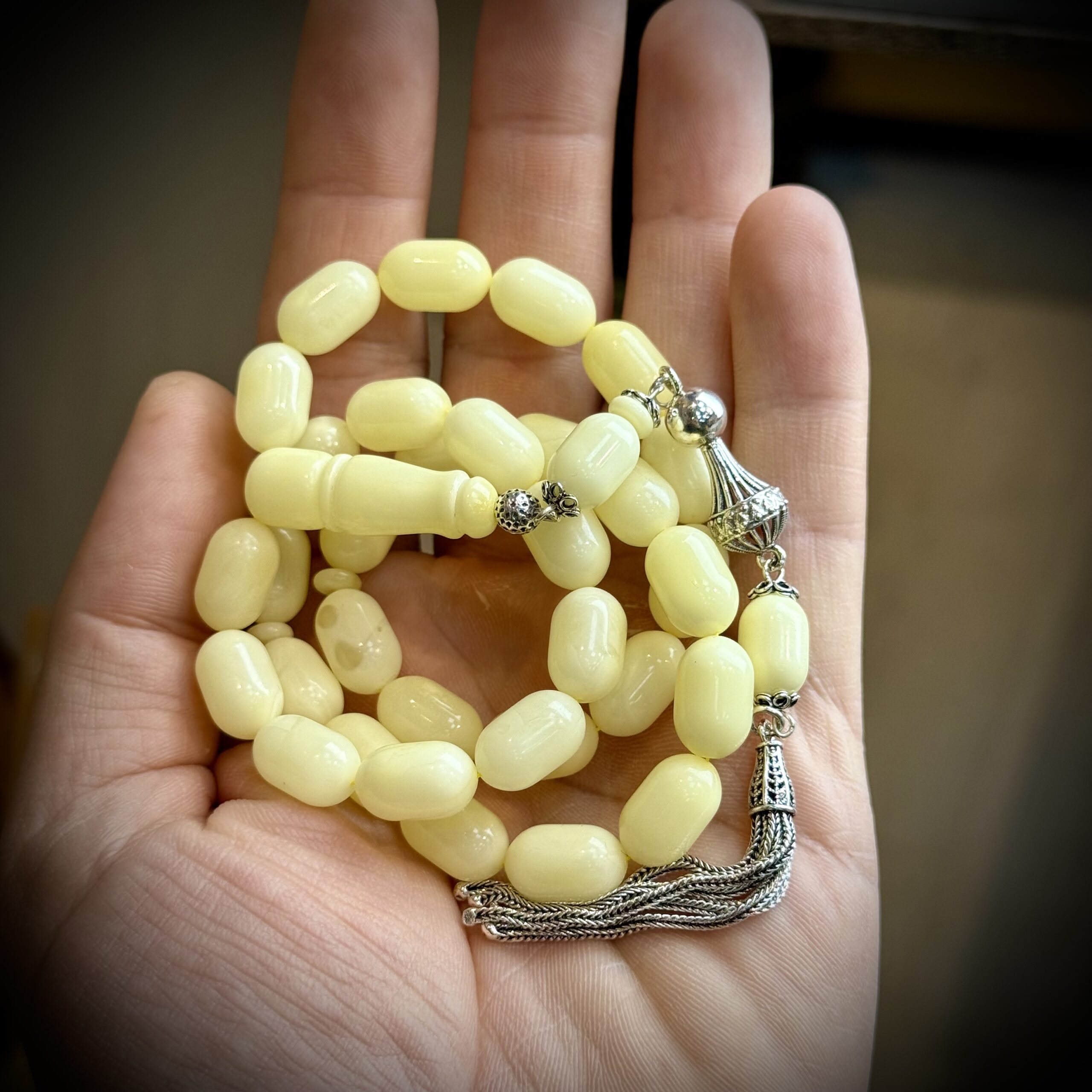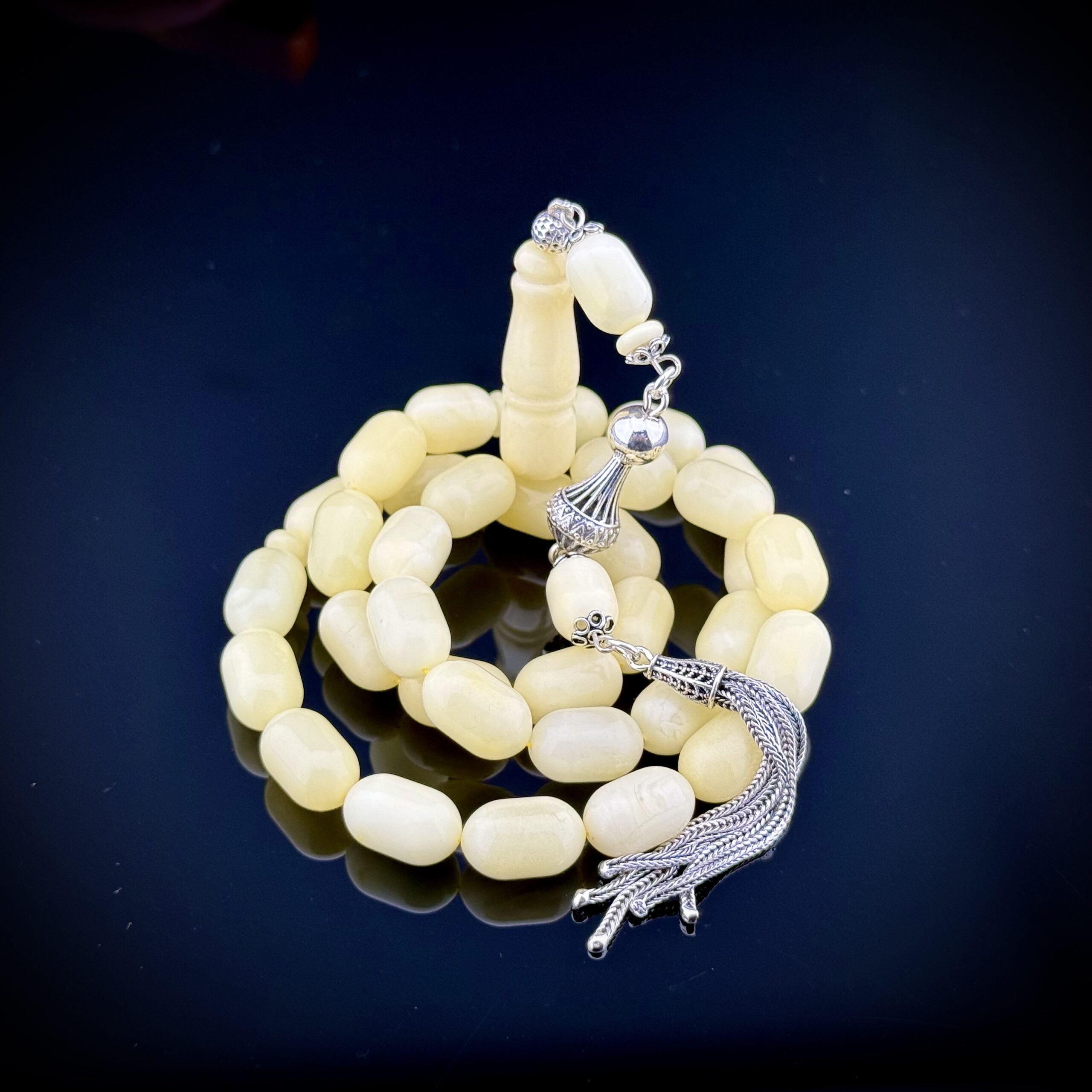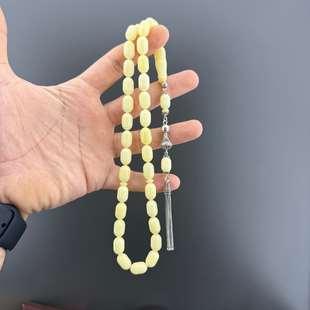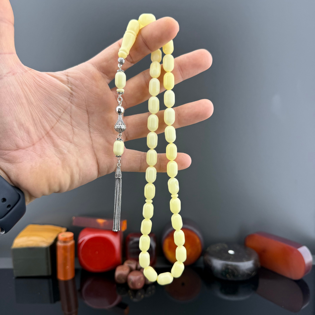 24.2 gram ağırlığındaki bu orijinal Rus Kaliningrad damla kehribar tesbih, 8,5x13,5mm kapsül kesimiyle zarafeti ve işçiliği bir arada sunuyor. Sarı kehribarın doğal ışıltısı, 6.5 gram 925 ayar gümüş püskül ile tamamlanarak hem estetik hem de prestijli bir tasarım ortaya çıkarıyor. Günlük kullanıma uygun yapısı ve koleksiyon değeriyle tesbih severlerin gözdesi olacak bu model, elde duruşu ve akıcı çekimiyle keyifli bir kullanım sağlıyor. Kaliteden ödün vermeyenler için özel olarak tasarlandı.