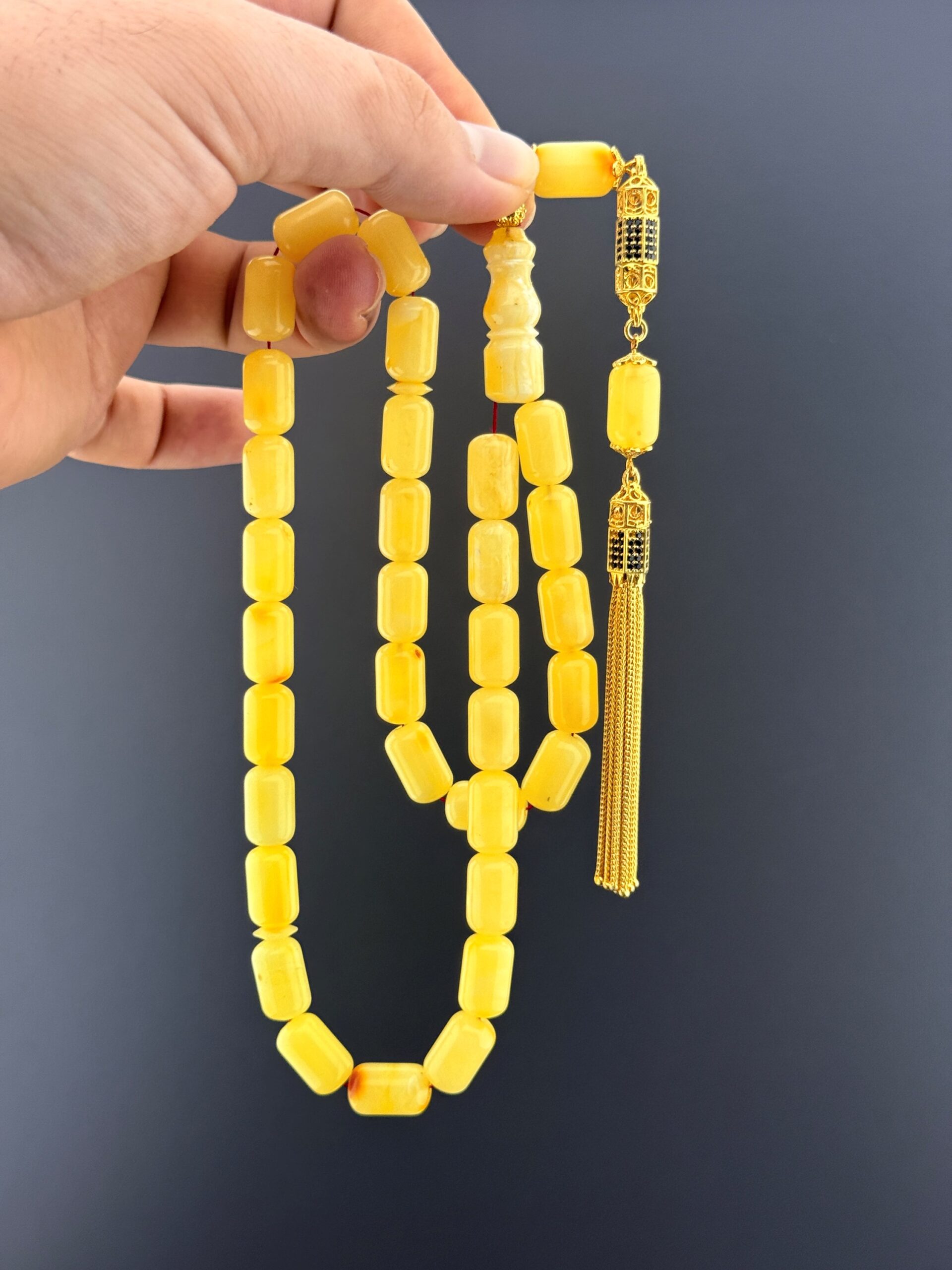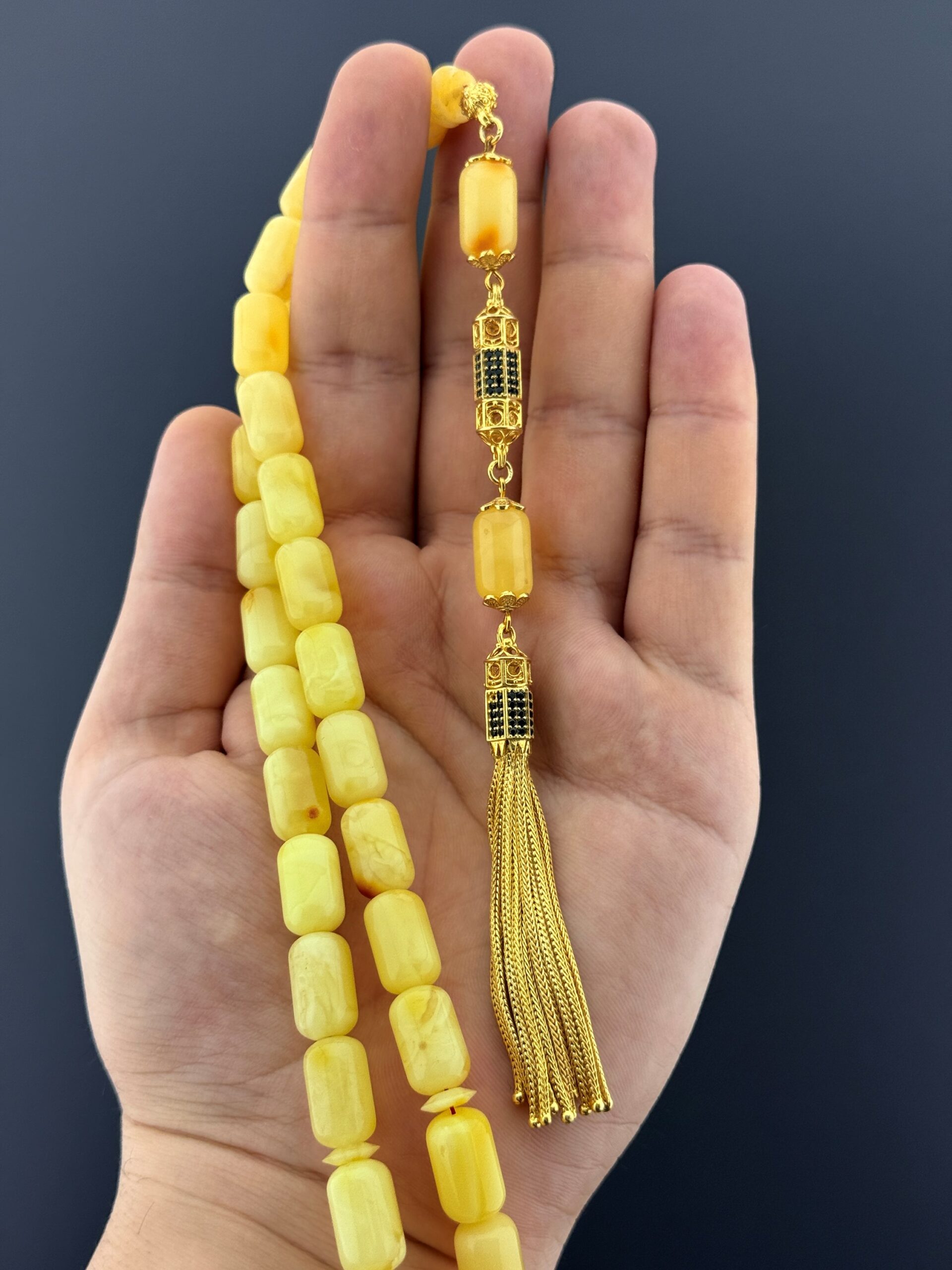 💢RUS KALININGRAD DAMLA KEHRİBAR TESBİH – 33,7 GR AĞIRLIK VE 13,6 GR DIAMOND GÜMÜŞ PÜSKÜLLE ZARAFETİN IŞILTISI💢 Sarı rengin parlak ve berrak tonlarını taşıyan bu özel damla kehribar tesbih, 33,7 gram ağırlığı ve 13,6 gramlık diamond gümüş püskülüyle göz alıcı bir duruş sergiliyor. 9x15 mm ölçüsündeki kapsül kesim taneler, elde tok ve dengeli bir çekim hissi sunarken; şık püskül detaylarıyla estetik bir bütünlük sağlıyor. Kaliteyi ve zarafeti bir arada arayanlar için koleksiyonluk değere sahip özel bir modeldir. 📿 Tesbih Malzemesi: Rus Kaliningrad Damla Kehribar 📿 Tane Ölçüsü: 9x15 mm 📿 Tane Tipi: Kapsül Kesim 📿 Püskül: 13,6 gr Diamond Gümüş Püskül