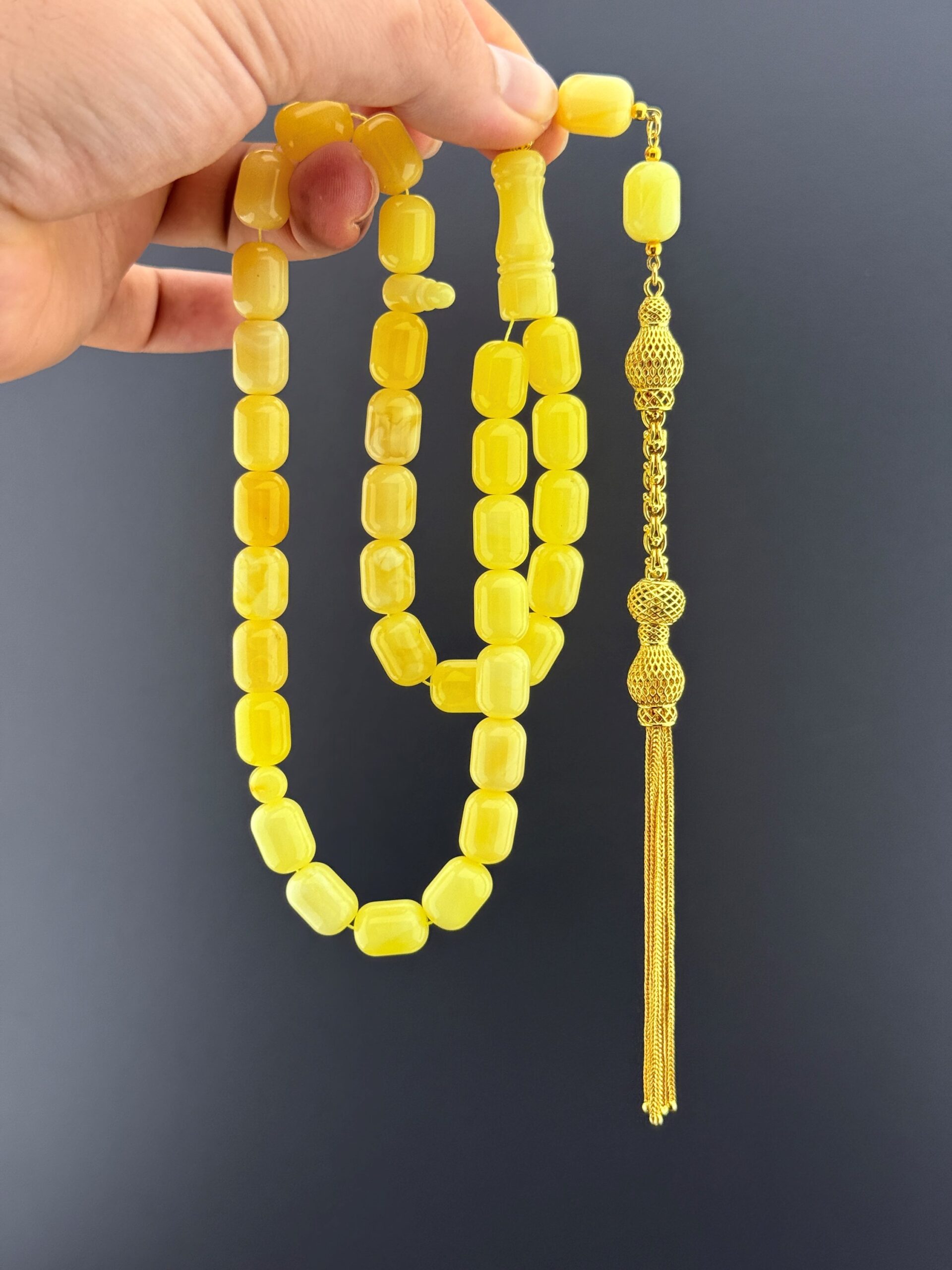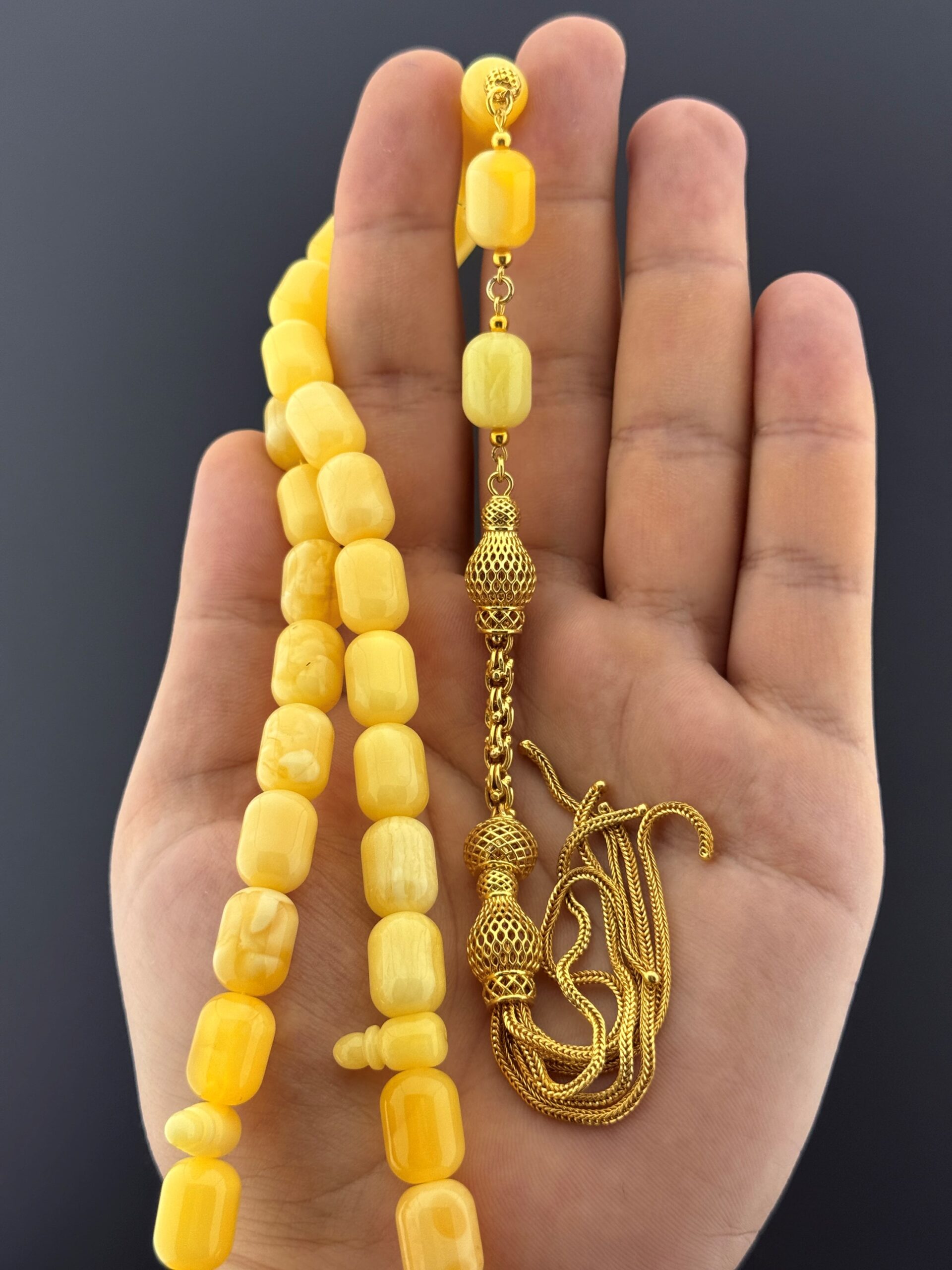 💢RUS KALININGRAD DAMLA KEHRİBAR TESBİH – 36,1 GR GÜCÜ, 12,7 GR ÖZEL TASARIM PÜSKÜLLE ZARAFETİ BİR ARADA💢 Sarı rengin canlı ve berrak tonlarını yansıtan bu özel damla kehribar tesbih, 36,1 gramlık ağırlığı ve 12,7 gramlık özel tasarım gümüş püskülüyle üst düzey bir şıklık sunuyor. 10x13,5 mm ölçüsündeki kapsül kesim taneler, elde tok ve dolgun bir çekim hissi sağlarken; özgün püskül tasarımıyla koleksiyonluk niteliğini pekiştiriyor. Gerek malzeme kalitesi gerek estetik bütünlüğüyle dikkat çeken, seçkin zevklere hitap eden özel bir modeldir. 📿 Tesbih Malzemesi: Rus Kaliningrad Damla Kehribar 📿 Tane Ölçüsü: 10x13,5 mm 📿 Tane Tipi: Kapsül Kesim 📿 Püskül: 12,7 gr Özel Tasarım Gümüş Püskül