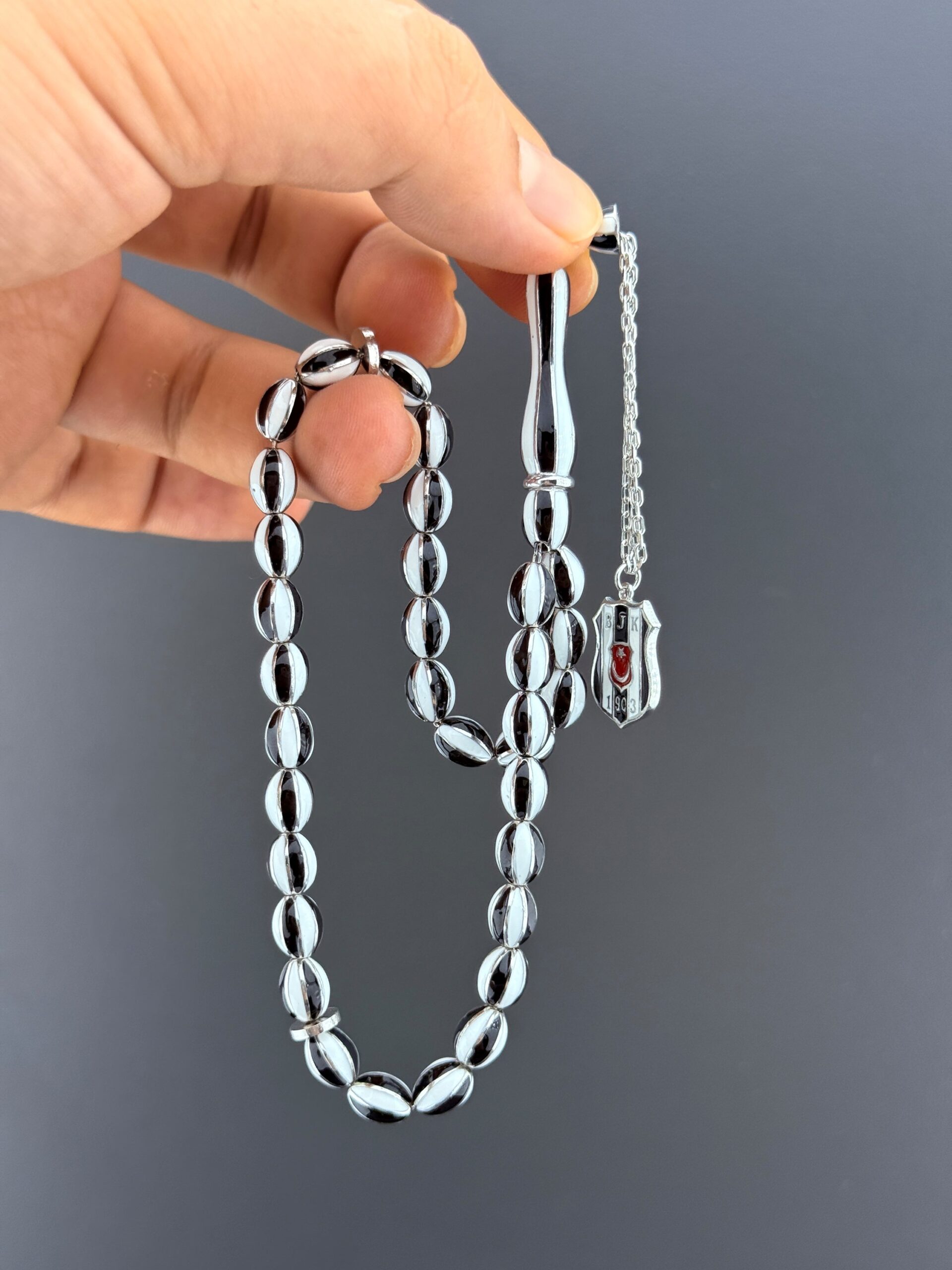 💢38,5 GR BJK’Lİ GÜMÜŞ TESBİH – SİYAH BEYAZ BEYZİ KESİM💢 38,5 gram ağırlığındaki bu özel tasarım BJK’li gümüş tesbih, siyah ve beyaz renklerin asil kontrastını yansıtan zarif bir tasarıma sahiptir. 6,5x8,5 mm ölçülerindeki beyzi kesim taneler, elde dengeli bir kullanım ve akıcı bir ritim sunarken, takım ruhunu estetik bir biçimde ön plana çıkarır. Gümüş püskül, tesbihin klasik duruşunu tamamlayarak koleksiyonlarda yer alabilecek seçkin bir görünüm kazandırır. 📿 Tesbih Malzemesi: 925 Ayar Gümüş 📿 Tane Ölçüsü: 6,5x8,5 mm 📿 Tane Tipi: Beyzi Kesim 📿 Püskül: Gümüş Püskül