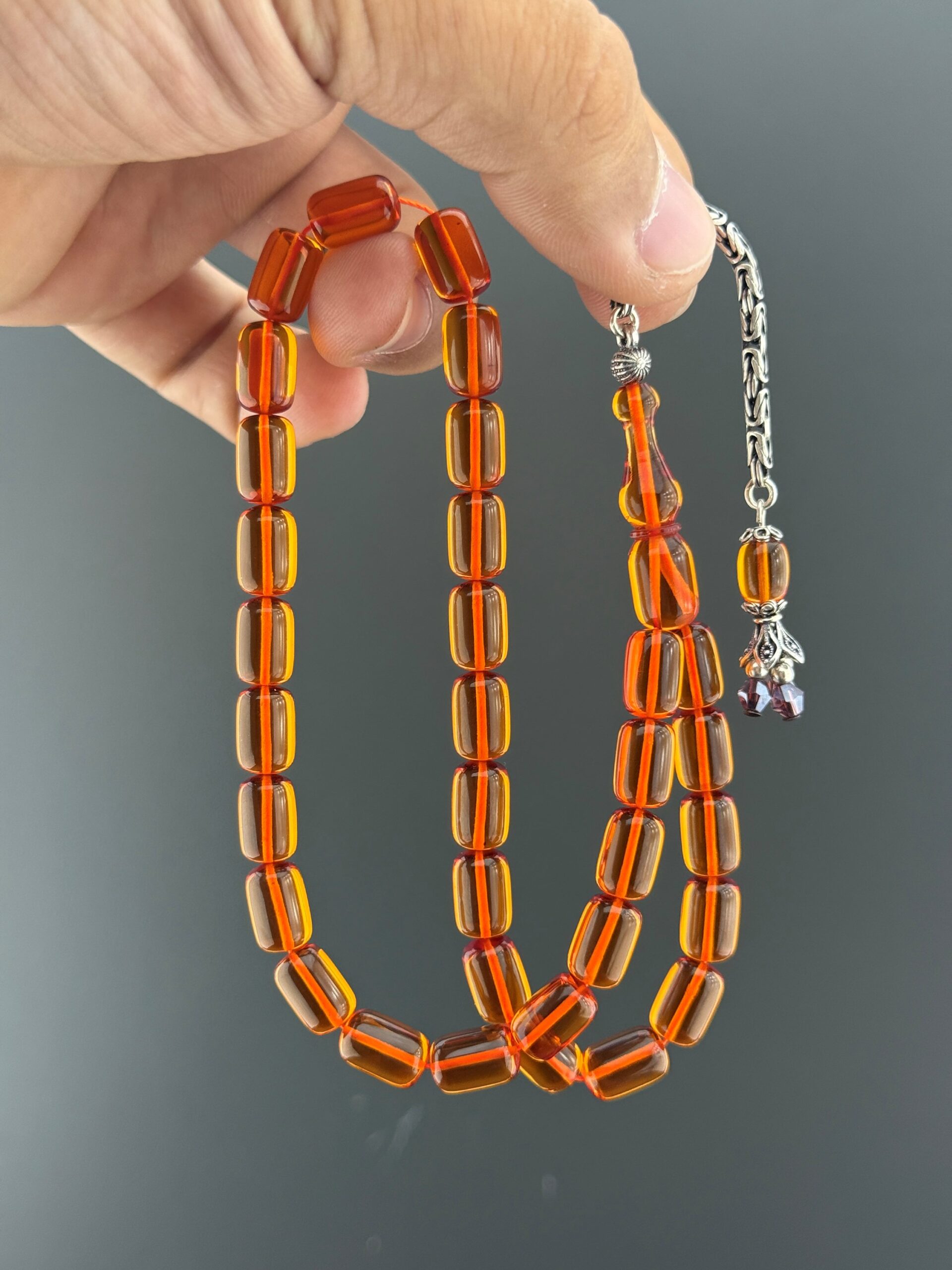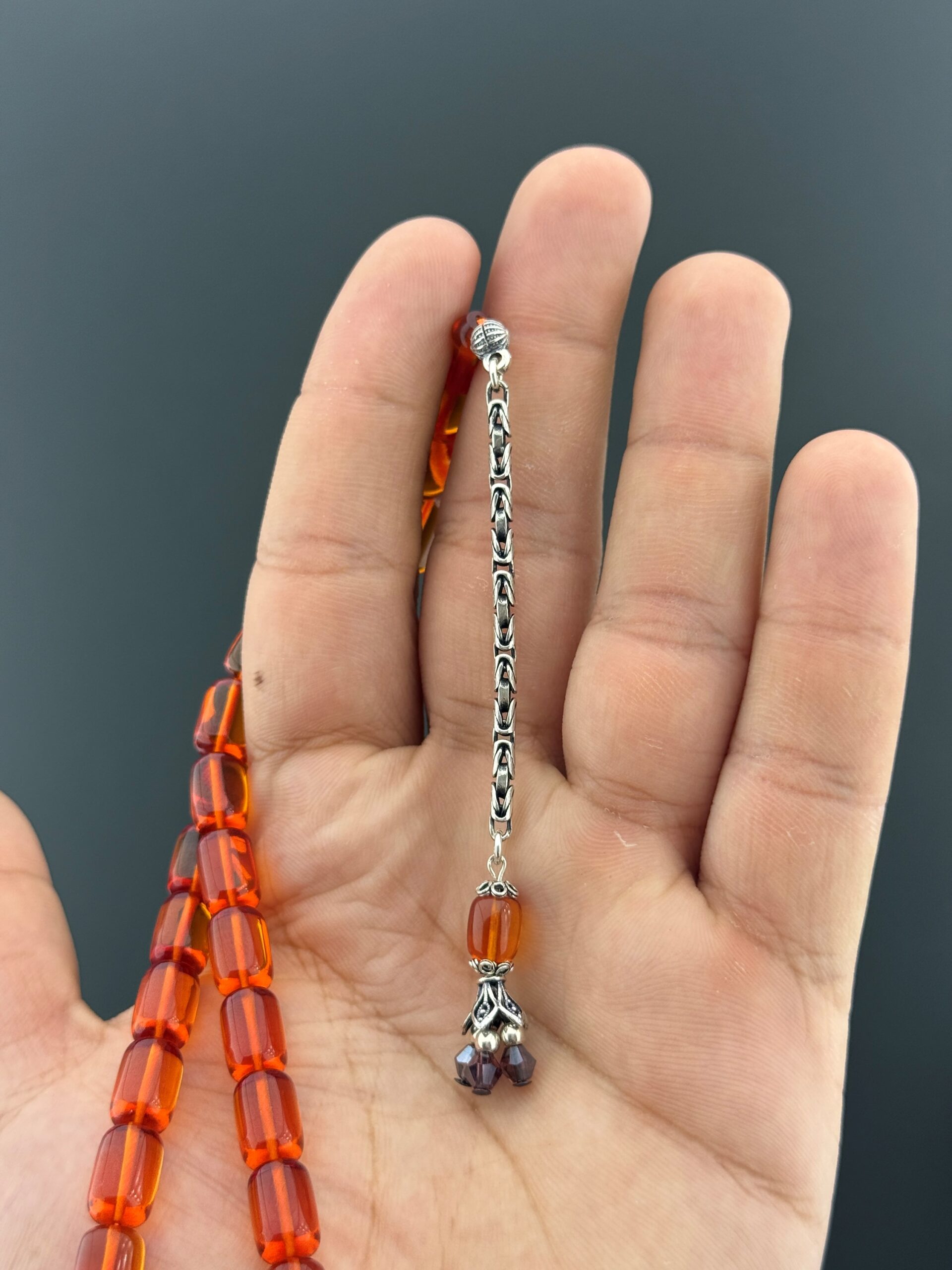 💢ALİ ALBAYRAK USTA İŞÇİKLİ ATEŞ KEHRİBAR TESBİH – TURUNCU TONUYLA GÖZ ALICI💢 Ateş kehribarın zarif yapısını yansıtan bu kapsül kesim tesbih, 7,25x11mm ölçülerindeki taneleriyle elde akıcı ve dengeli bir kullanım deneyimi sunar. 4 gr 925 ayar gümüş püskül detayı, modele hem estetik hem de değerli bir şıklık kazandırır. Turuncu rengin enerjik ve dikkat çekici tonu, bu tesbihe canlı bir görünüm kazandırır. Günlük kullanım için zarif bir tercih olmasının yanı sıra koleksiyonlarda da seçkin bir parça olarak öne çıkar. Ali Albayrak ustalığının inceliklerini taşıyan bu model, tesbih tutkunları için özel bir alternatiftir. 📿 Tesbih Malzemesi: Ateş Kehribar 📿 Tane Ölçüsü: 7,25x11mm 📿 Tane Tipi: Kapsül Kesim 📿 Püskül: 4 gr 925 Ayar Gümüş Püskül 📿 Renk: Turuncu