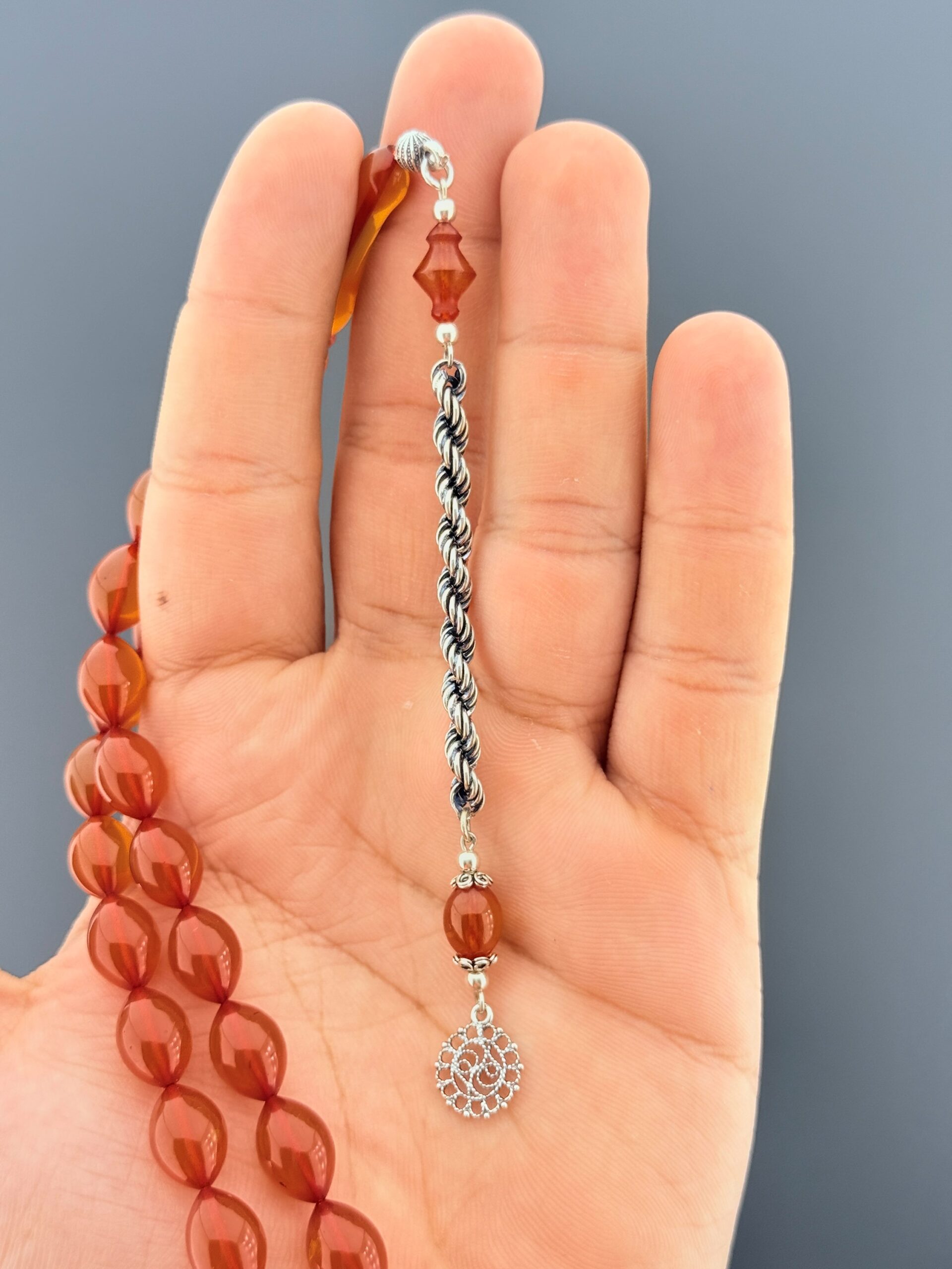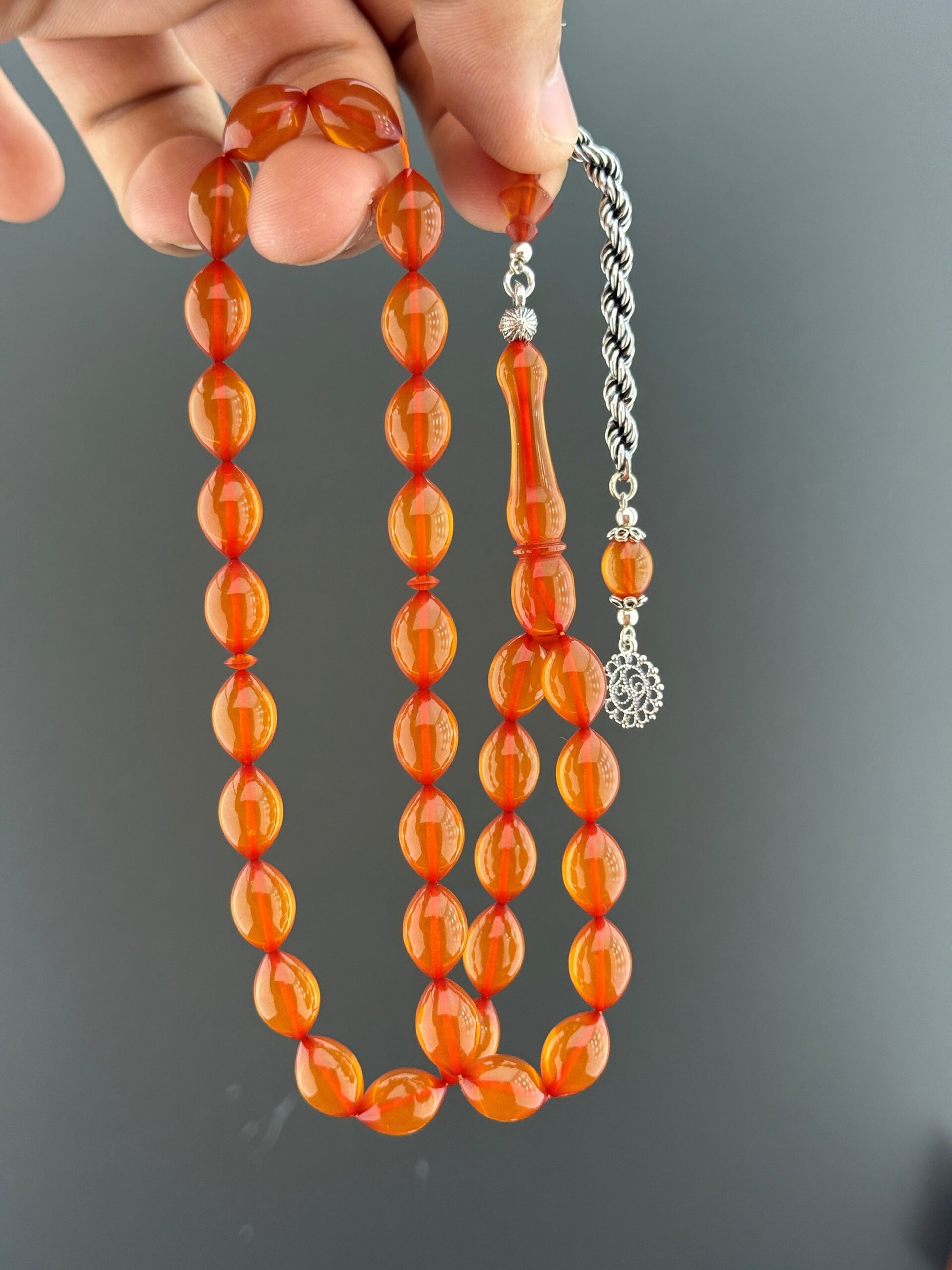 💢OSMAN EROĞLU USTA İŞÇİKLİ SIKMA KEHRİBAR TESBİH – KAYISI TONUYLA SICAK VE ZARİF💢 Sıkma kehribarın estetik dokusunu yansıtan bu beyzi kesim tesbih, 9x13mm ölçülerindeki taneleriyle elde tok ve dengeli bir kullanım deneyimi sunar. 4,2 gr 925 ayar gümüş püskül detayı ise tesbihe zarif bir şıklık katar. Kayısı renginin sıcak ve dikkat çekici tonu, bu modele canlı bir enerji kazandırır. Günlük kullanım için ideal bir tercih olmasının yanı sıra koleksiyonlarda da öne çıkan özel bir parçadır. Osman Eroğlu ustalığının işçiliğiyle birleşen bu tesbih, estetik ve değerli bir alternatif olarak tesbih tutkunlarına hitap eder. 📿 Tesbih Malzemesi: Sıkma Kehribar 📿 Tane Ölçüsü: 9x13mm 📿 Tane Tipi: Beyzi Kesim 📿 Püskül: 4,2 gr 925 Ayar Gümüş Püskül 📿 Renk: Kayısı