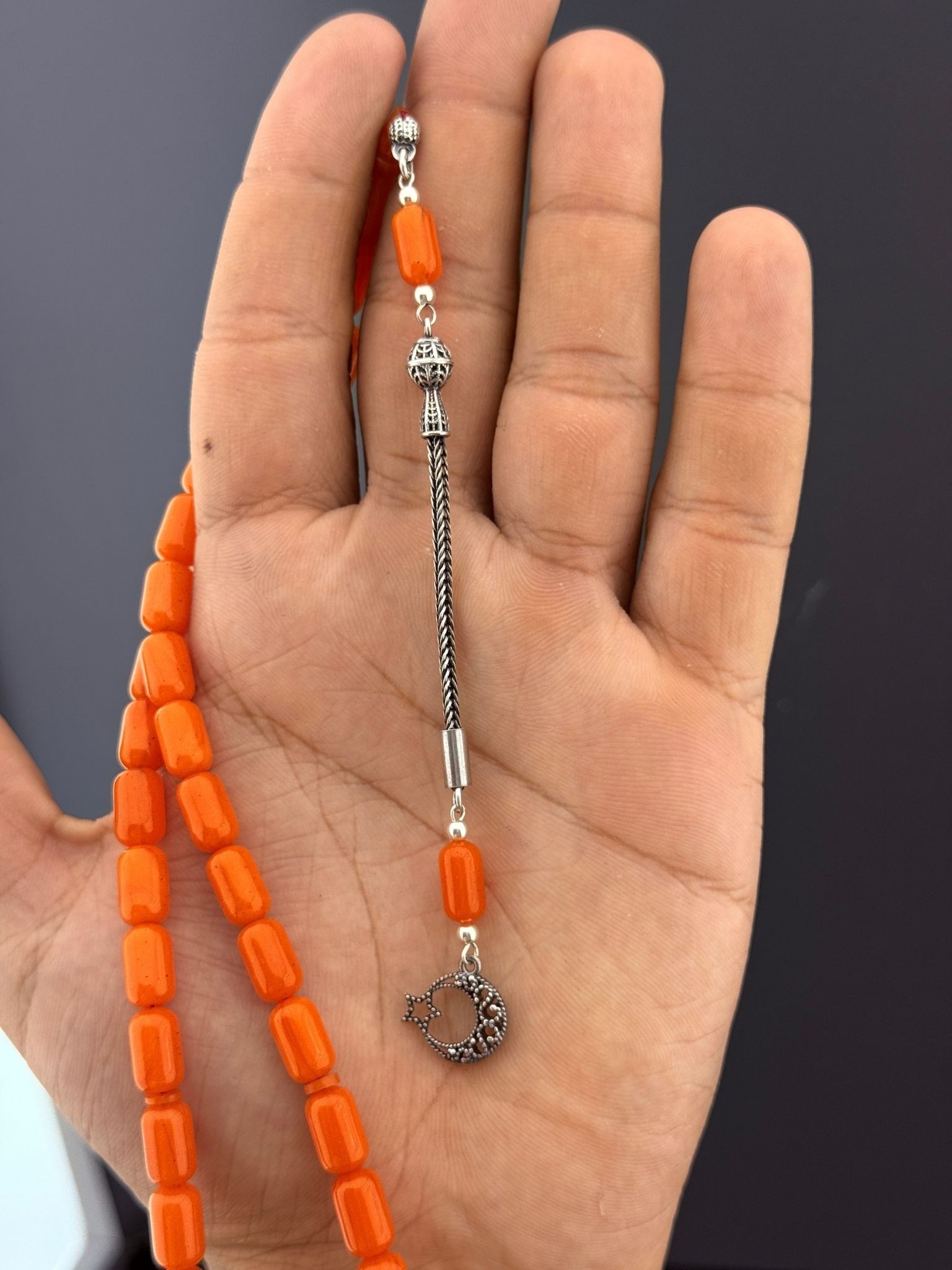💢BEKİR ENSARİ USTA İŞÇİKLİ KATALİN TESBİH – TURUNCU💢 7x11mm ölçülerinde kapsül kesim taneleriyle özenle hazırlanan bu katalin tesbih, Bekir Ensari’nin ince işçiliğini ve turuncu rengin canlı enerjisini bir araya getiriyor. Koleksiyonunda farklı bir dokunuş arayanlar için hem estetik hem de değerli bir seçenektir. 925 ayar gümüş püskülü ile tamamlanan bu özel parça, elde şık bir duruş sunar ve zamansız bir zarafet taşır. 📿 Tesbih Malzemesi: Katalin 📿 Tane Ölçüsü: 7x11mm 📿 Tane Tipi: Kapsül Kesim 📿 Püskül: 4,4 gr. 925 Ayar Gümüş