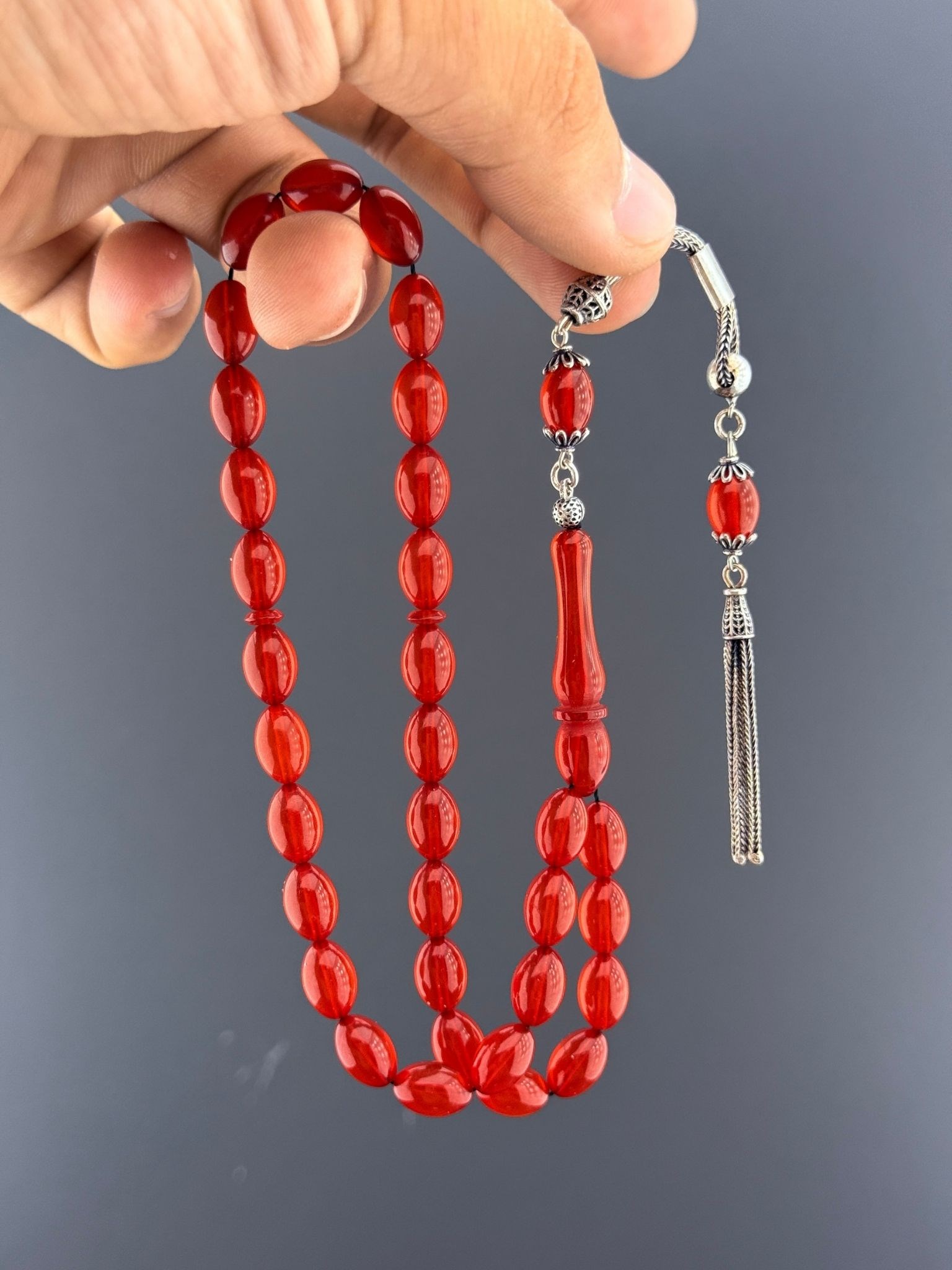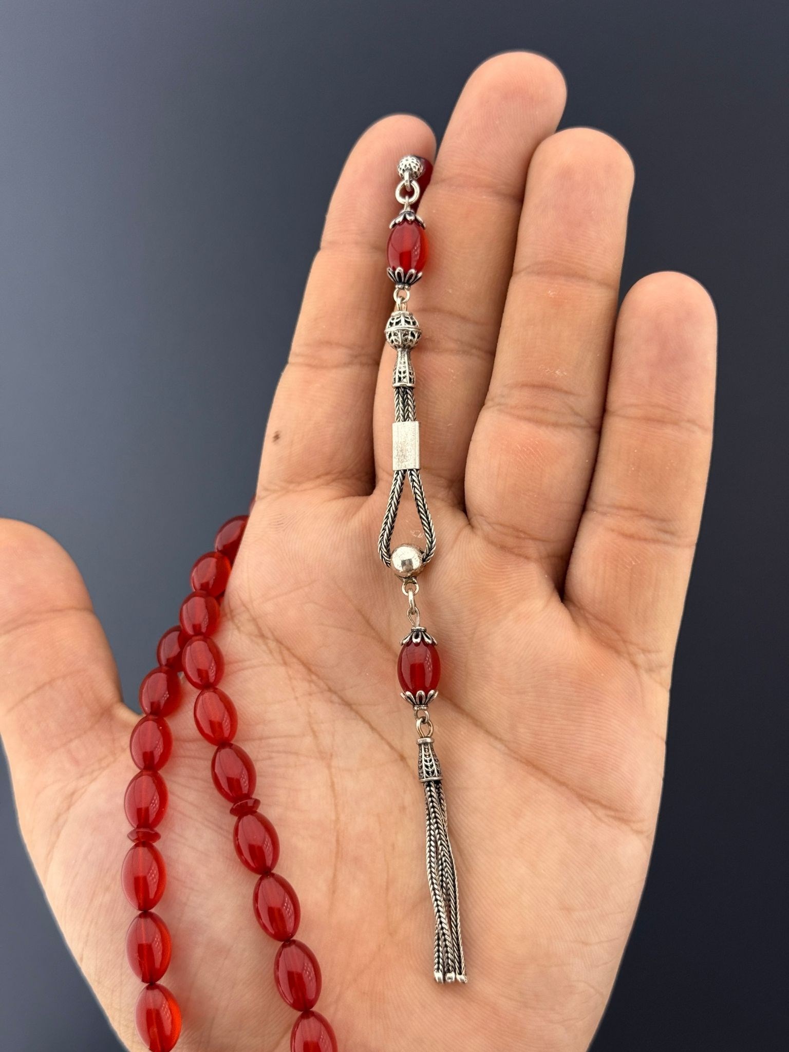 💢SIKMA KEHRİBAR TESBİH – KIRMIZI💢 7,25x10,75mm ölçülerinde beyzi kesim tanelerden oluşan bu sıkma kehribar tesbih, 4,9 gram ağırlığındadır. Kırmızı rengin canlılığı ile dikkat çeken tesbih, elde şık bir duruş sergiler. 925 ayar gümüş püskül ile tamamlanan bu parça, zarifliği ve kullanım rahatlığıyla öne çıkar. 📿 Tesbih Malzemesi: Sıkma Kehribar 📿 Tane Ölçüsü: 7,25x10,75mm 📿 Tane Tipi: Beyzi Kesim 📿 Püskül: 925 Ayar Gümüş