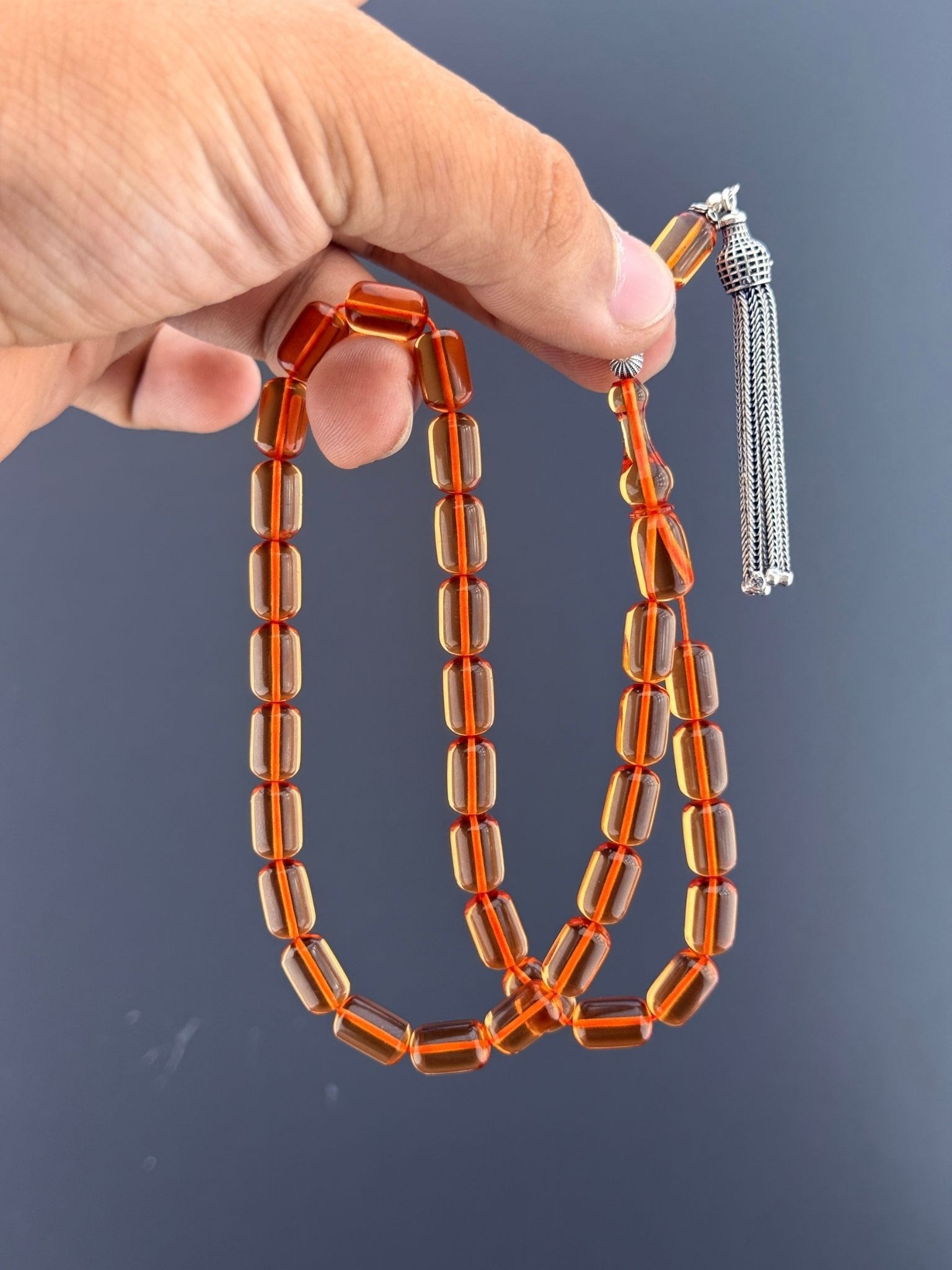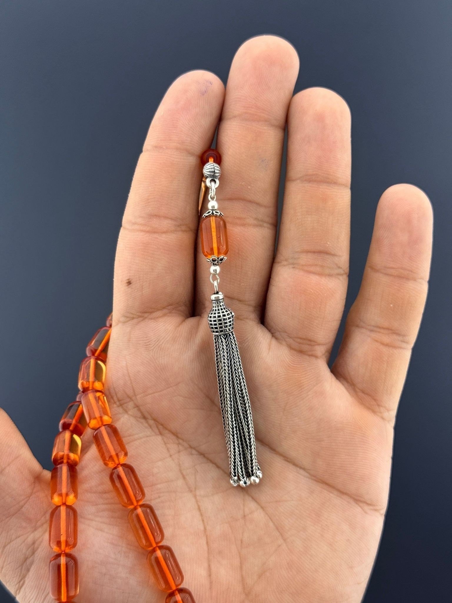 💢6,1 GR. 925 AYAR GÜMÜŞ PÜSKÜLLÜ ALİ ALBAYRAK ATEŞ KEHRİBAR TESBİH – TURUNCU💢 Ali Albayrak’ın usta işçiliğiyle hazırlanmış bu özel ateş kehribar tesbih, 7x11,5mm ölçülerinde kapsül kesim taneleriyle estetik bir görünüme sahiptir. Turuncu renginin canlılığı tesbihin zarif duruşunu güçlendirirken, 6,1 gramlık 925 ayar gümüş püskül ise parçaya değerli bir şıklık katmaktadır. Koleksiyoncular ve günlük kullanımda şıklığına önem verenler için ayrıcalıklı bir tesbihtir. 📿 Tesbih Malzemesi: Ateş Kehribar 📿 Tane Ölçüsü: 7x11,5mm 📿 Tane Tipi: Kapsül Kesim 📿 Püskül: 6,1 gr. 925 Ayar Gümüş Püskül