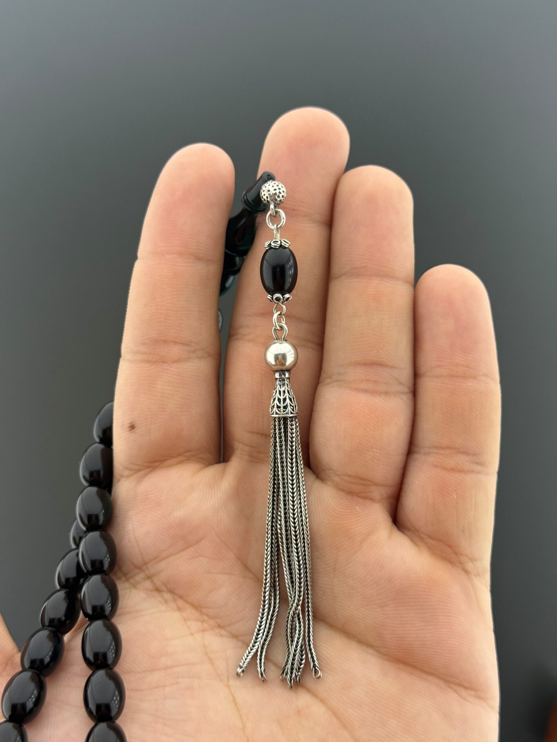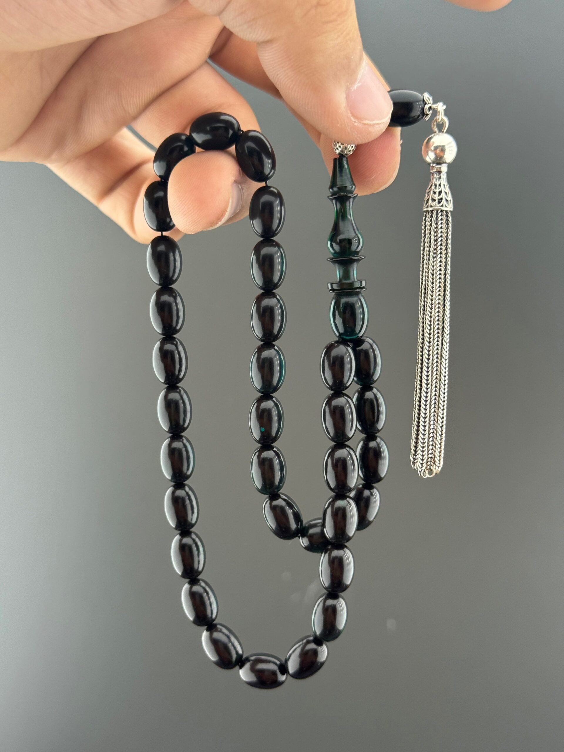 💢MUHAMMET SAİT GÜL USTA İŞÇİKLİ 6,2 GR 925 AYAR GÜMÜŞ PÜSKÜLLÜ SIKMA KEHRİBAR TESBİH – SİYAH YEŞİL YANSIMALARIYLA GÖZ ALICI💢 Sıkma kehribarın özel dokusunu yansıtan bu beyzi kesim tesbih, 7,5x11mm ölçülerindeki taneleriyle elde dengeli ve akıcı bir kullanım sunar. 6,2 gr ağırlığındaki 925 ayar gümüş püskül detayı, modele hem değer hem de prestijli bir görünüm kazandırır. Siyah zemin üzerine düşen yeşil yansımalar, tesbihe mistik ve etkileyici bir hava katar. Günlük kullanım için zarif bir seçenek olmasının yanı sıra koleksiyonlarda da dikkat çekici bir parça olarak öne çıkar. Muhammet Sait Gül ustalığının titiz işçiliğiyle hazırlanmış bu model, tesbih tutkunları için seçkin bir alternatiftir. 📿 Tesbih Malzemesi: Sıkma Kehribar 📿 Tane Ölçüsü: 7,5x11mm 📿 Tane Tipi: Beyzi Kesim 📿 Püskül: 6,2 gr 925 Ayar Gümüş Püskül