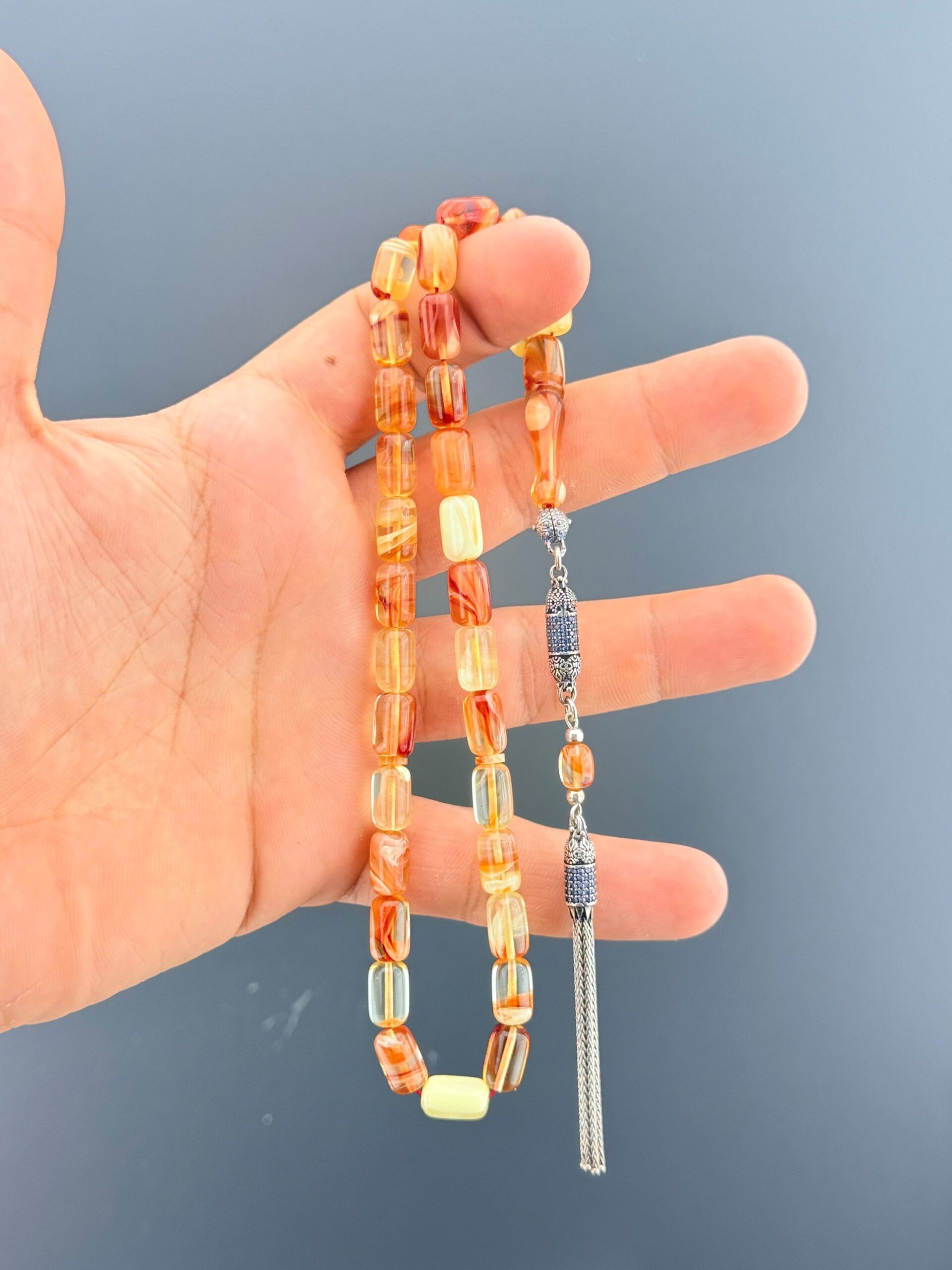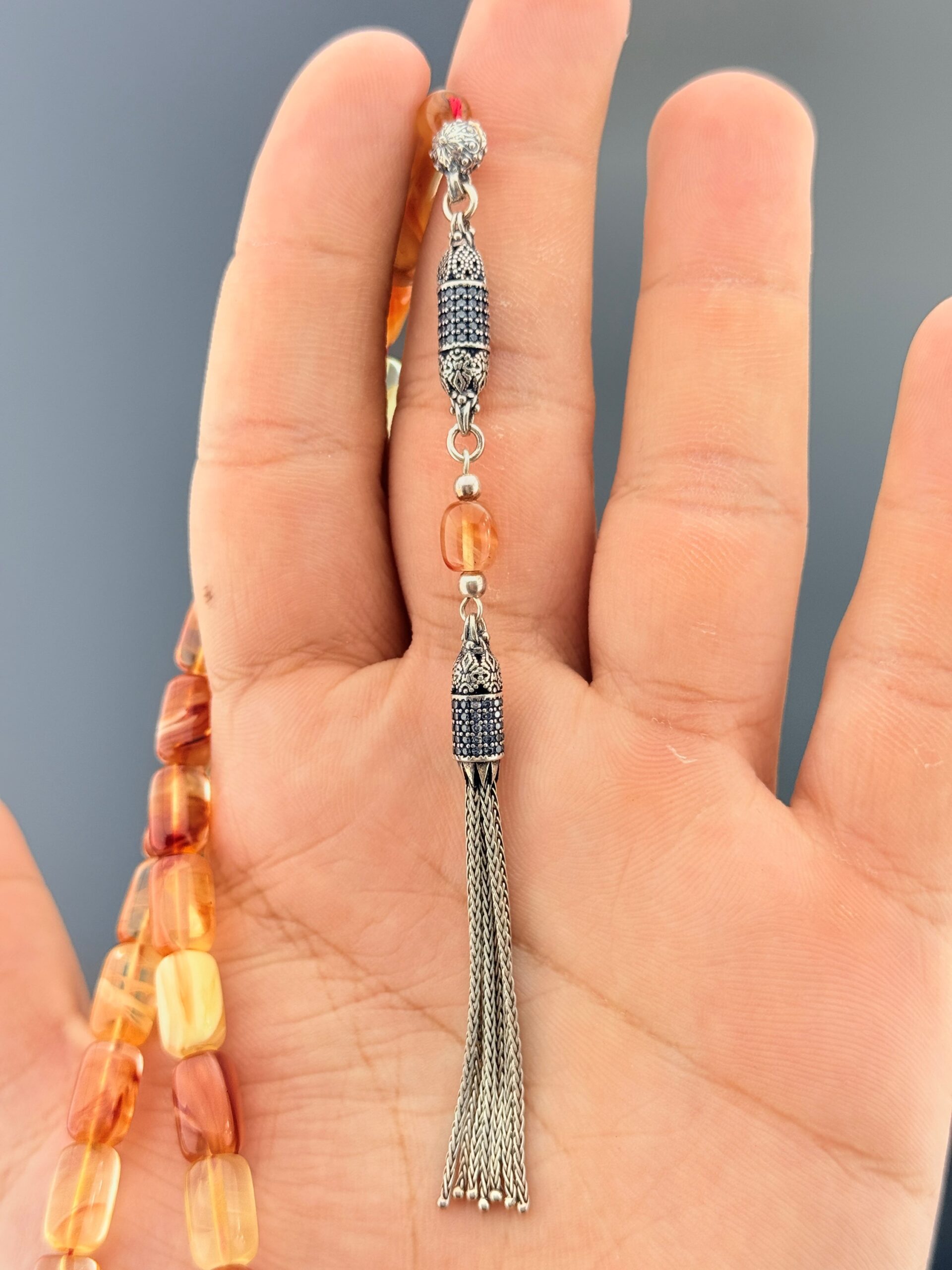 💢SIKMA KEHRİBAR TESBİH – ÇOK RENKLİ TONLARIYLA CANLI VE GÖZ ALICI💢 Sıkma kehribarın estetik yapısını yansıtan bu kapsül kesim tesbih, 7x11mm ölçülerindeki taneleriyle elde dengeli ve akıcı bir kullanım deneyimi sunar. 6,2 gr 925 ayar gümüş püskül detayı ise modele zarafet ve değer katar. Çok renkli yapısı sayesinde birkaç uyumlu tonu üzerinde barındıran bu özel model, enerjik ve farklı bir karakter sergiler. Günlük kullanım için dikkat çekici bir tercih olmasının yanı sıra koleksiyonlarda da seçkin bir parça olarak öne çıkar. 📿 Tesbih Malzemesi: Sıkma Kehribar 📿 Tane Ölçüsü: 7x11mm 📿 Tane Tipi: Kapsül Kesim 📿 Püskül: 6,2 gr 925 Ayar Gümüş Püskül