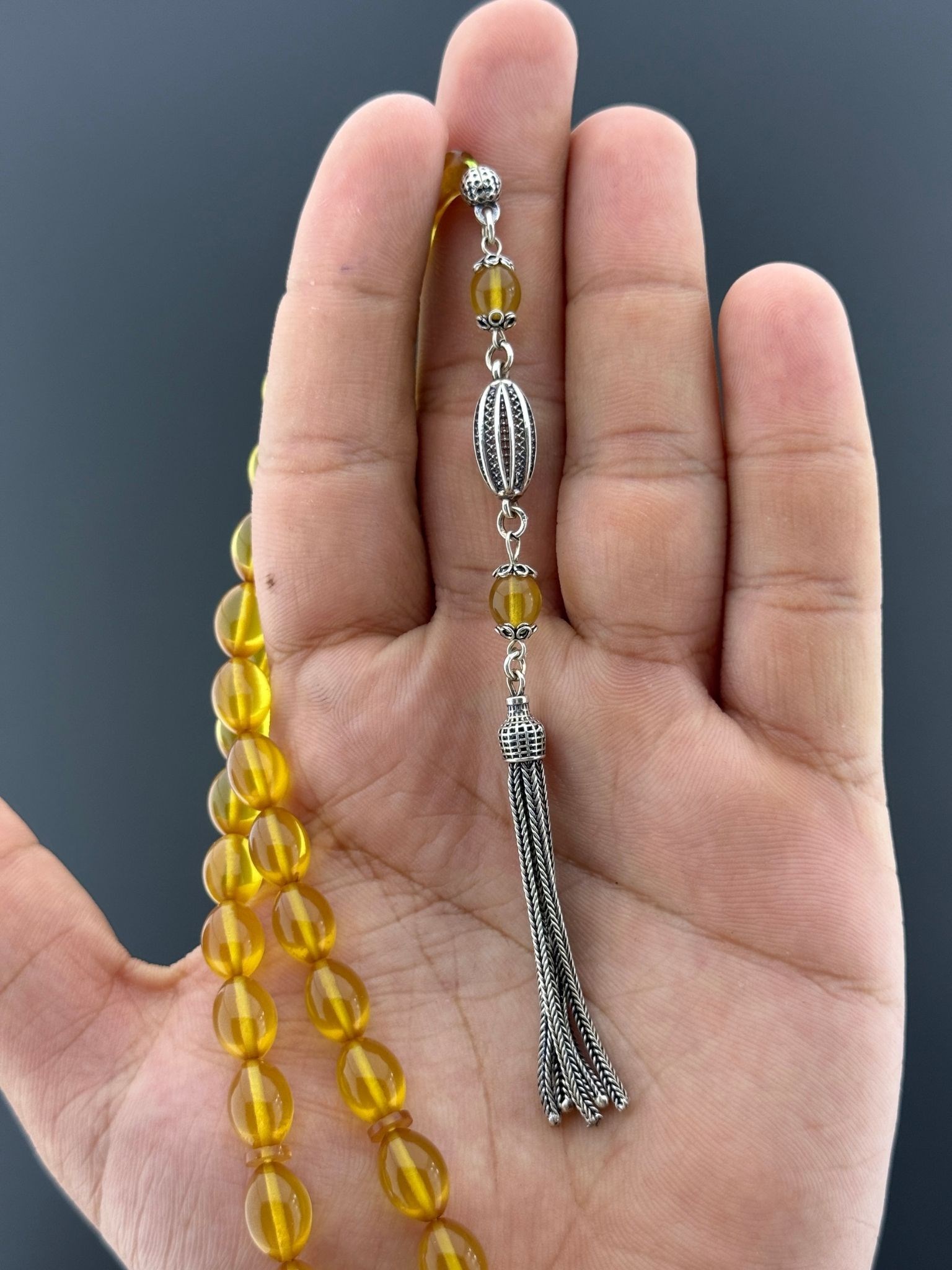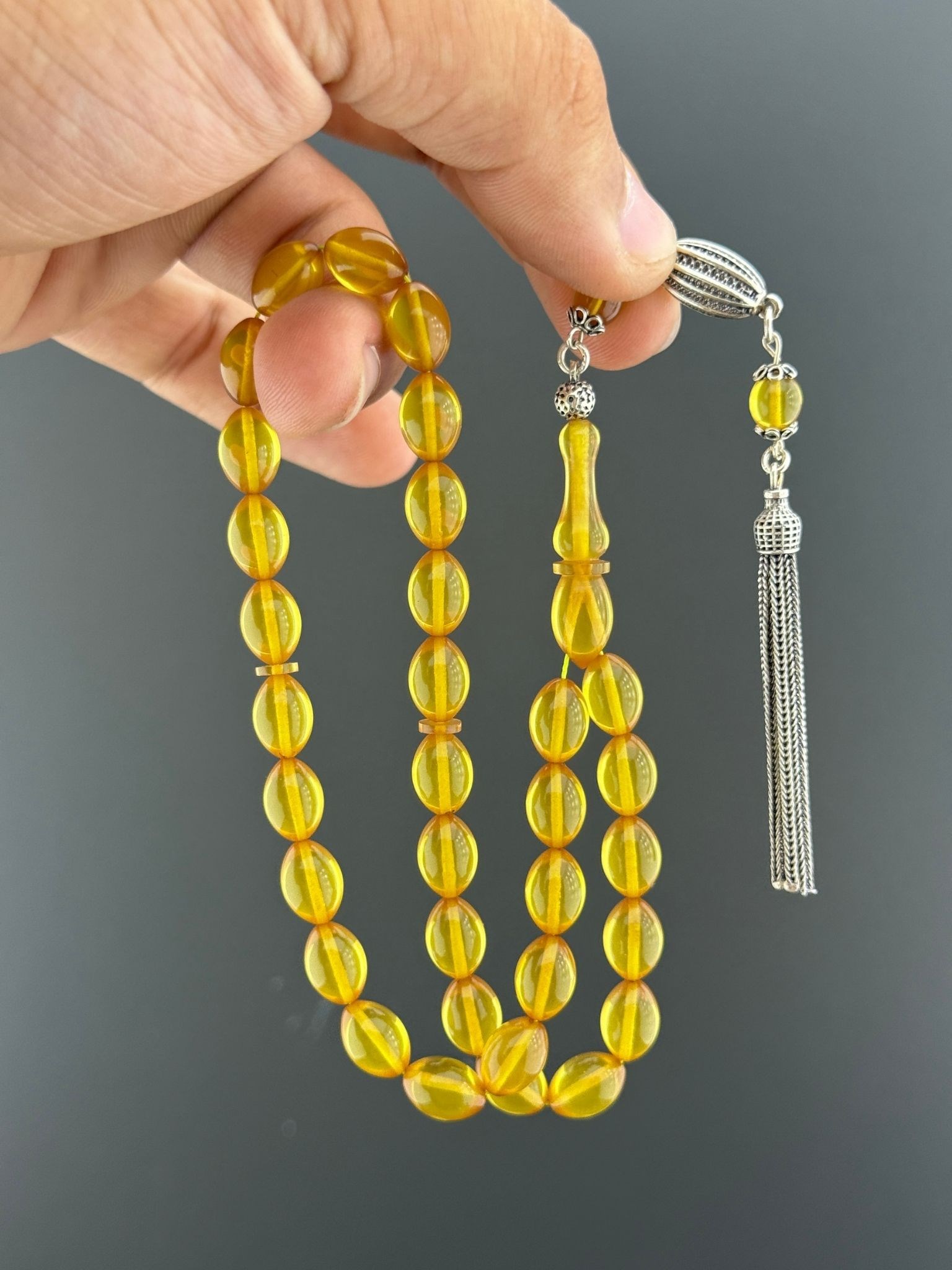 💢5 GR. 925 AYAR GÜMÜŞ PÜSKÜLLÜ ATEŞ KEHRİBAR TESBİH – SARI💢 7,75x11,25mm ölçülerinde beyzi kesim taneleriyle tasarlanmış bu tesbih, ateş kehribarın zarafetini ve estetiğini yansıtmaktadır. Parlak sarı rengiyle dikkat çeken model, elde şık bir duruş ve keyifli bir kullanım sunar. 5 gram ağırlığında olan bu özel tesbih, 925 ayar gümüş püskülüyle tamamlanarak koleksiyonlara değer katan özel bir parça haline gelmiştir. 📿 Tesbih Malzemesi: Ateş Kehribar 📿 Tane Ölçüsü: 7,75x11,25mm 📿 Tane Tipi: Beyzi Kesim 📿 Püskül: 925 Ayar Gümüş