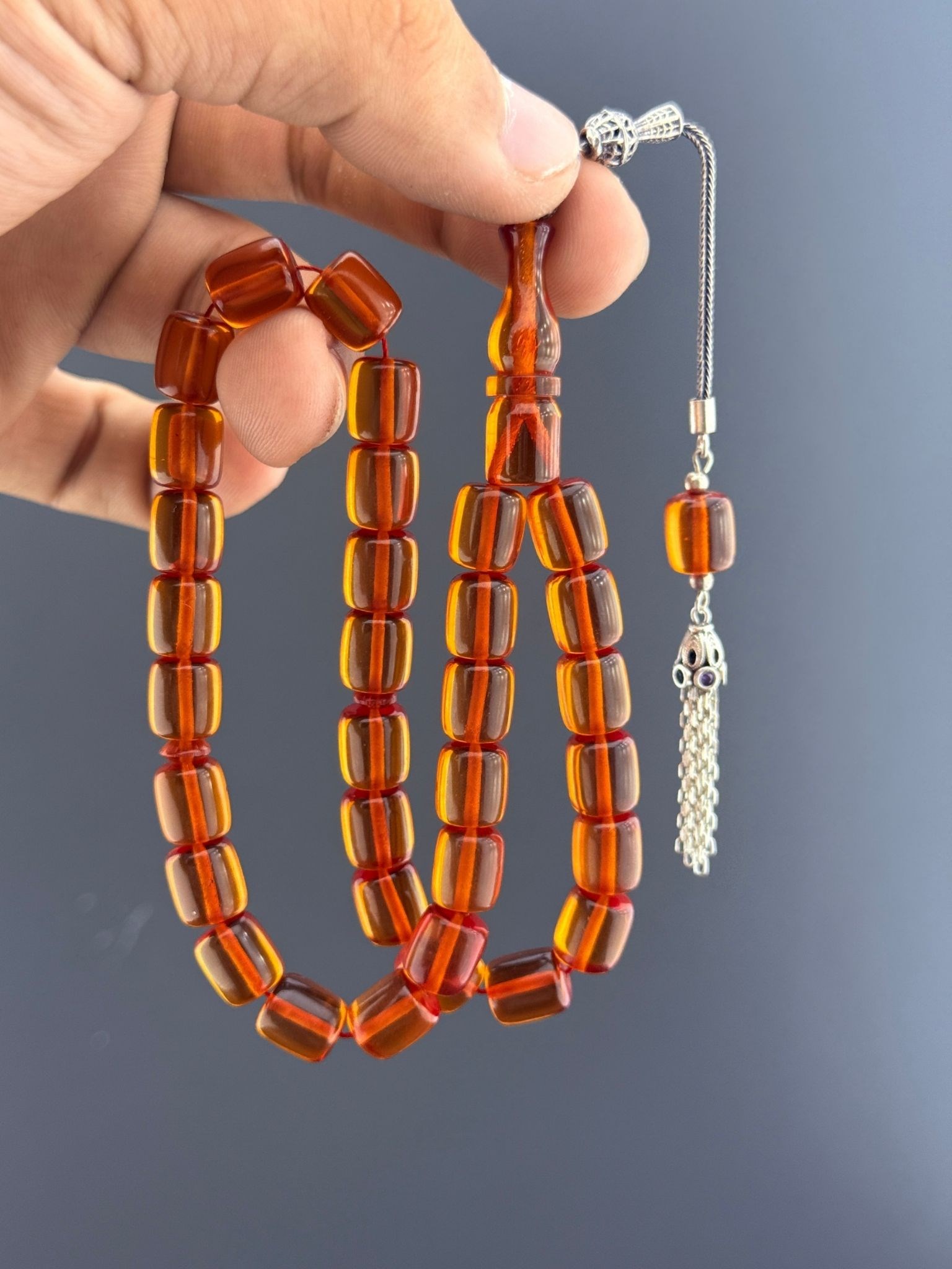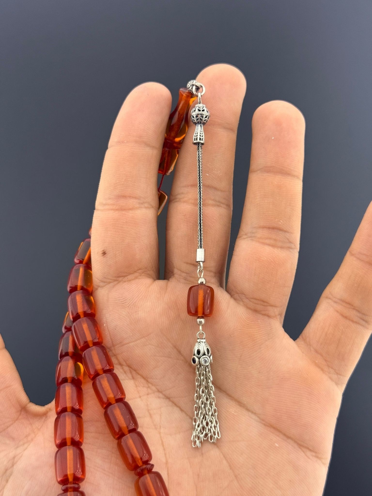 💢925 AYAR GÜMÜŞ PÜSKÜLLÜ ATEŞ KEHRİBAR TESBİH – TURUNCU💢 8,75x10mm ölçülerinde fıçı kesim taneleriyle hazırlanmış bu ateş kehribar tesbih, turuncu renginin enerjisiyle dikkat çekiyor. Özgün tasarımıyla elde estetik bir duruş sağlayan bu parça, 925 ayar gümüş püskülüyle değerini daha da artırıyor. Günlük kullanım için zarif, koleksiyonlar için ise özel bir tercih olacaktır. 📿 Tesbih Malzemesi: Ateş Kehribar 📿 Tane Ölçüsü: 8,75x10mm 📿 Tane Tipi: Fıçı Kesim 📿 Püskül: 925 Ayar Gümüş Püskül
