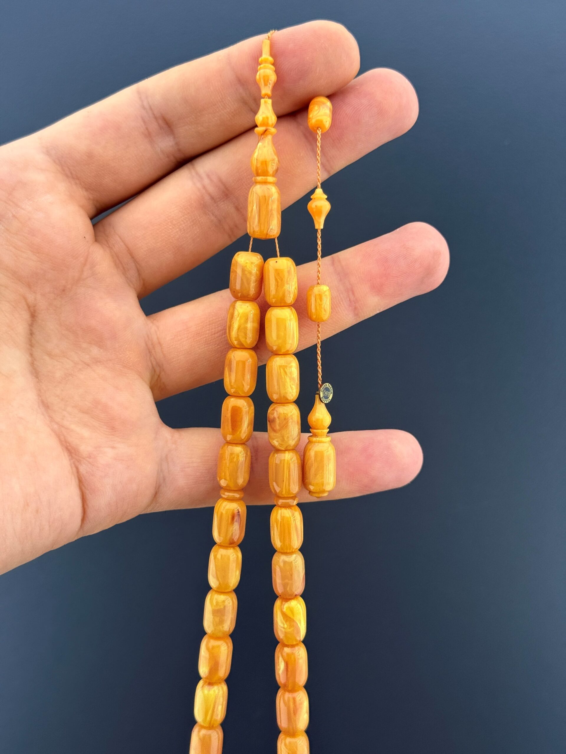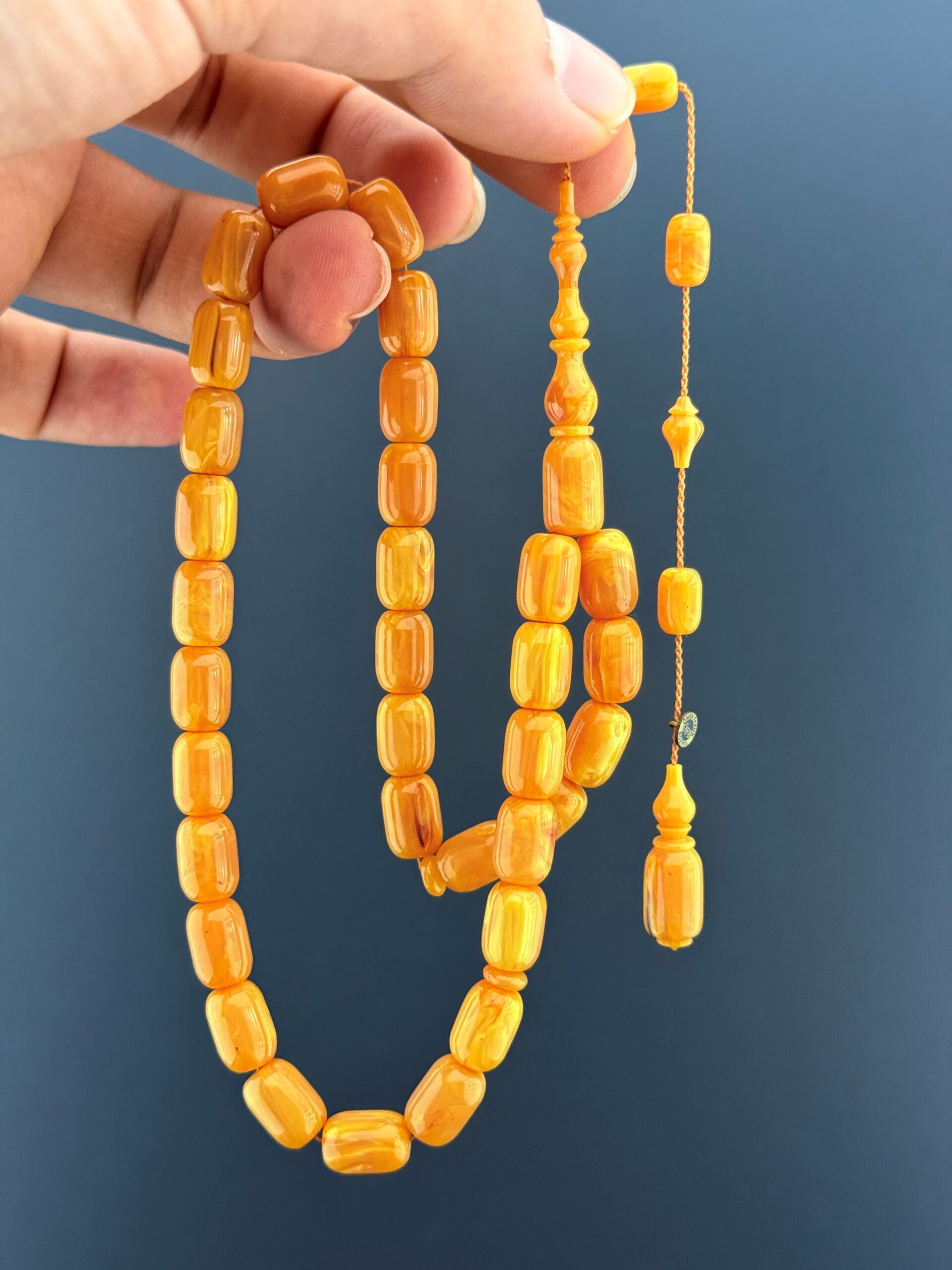 💢ÖMER FARUK BOZYEL USTA İŞÇİLİKLİ ESKİ ALMAN KATALİN – SÜMEN TAKIMINDAN NADİR BİR ESER💢 Sümen takımından çıkma bu özel eski Alman katalin, Ömer Faruk Bozyel’in temiz ve oturaklı işçiliğiyle karakter kazanıyor. Kapsül kesimin akıcı formu, sarı tonların nostaljik dokusuyla birleşerek koleksiyon değeri yüksek bir parça ortaya çıkarıyor. Malzemenin yaş almış yapısı, tesbihin her tanesinde doğal bir derinlik sunuyor. 📿 Tesbih Malzemesi: Eski Alman Katalin (Sümen Takımı) 📿 Tane Ölçüsü: 8x11,75 📿 Tane Tipi: Kapsül Kesim 📿 Püskül: Sistem