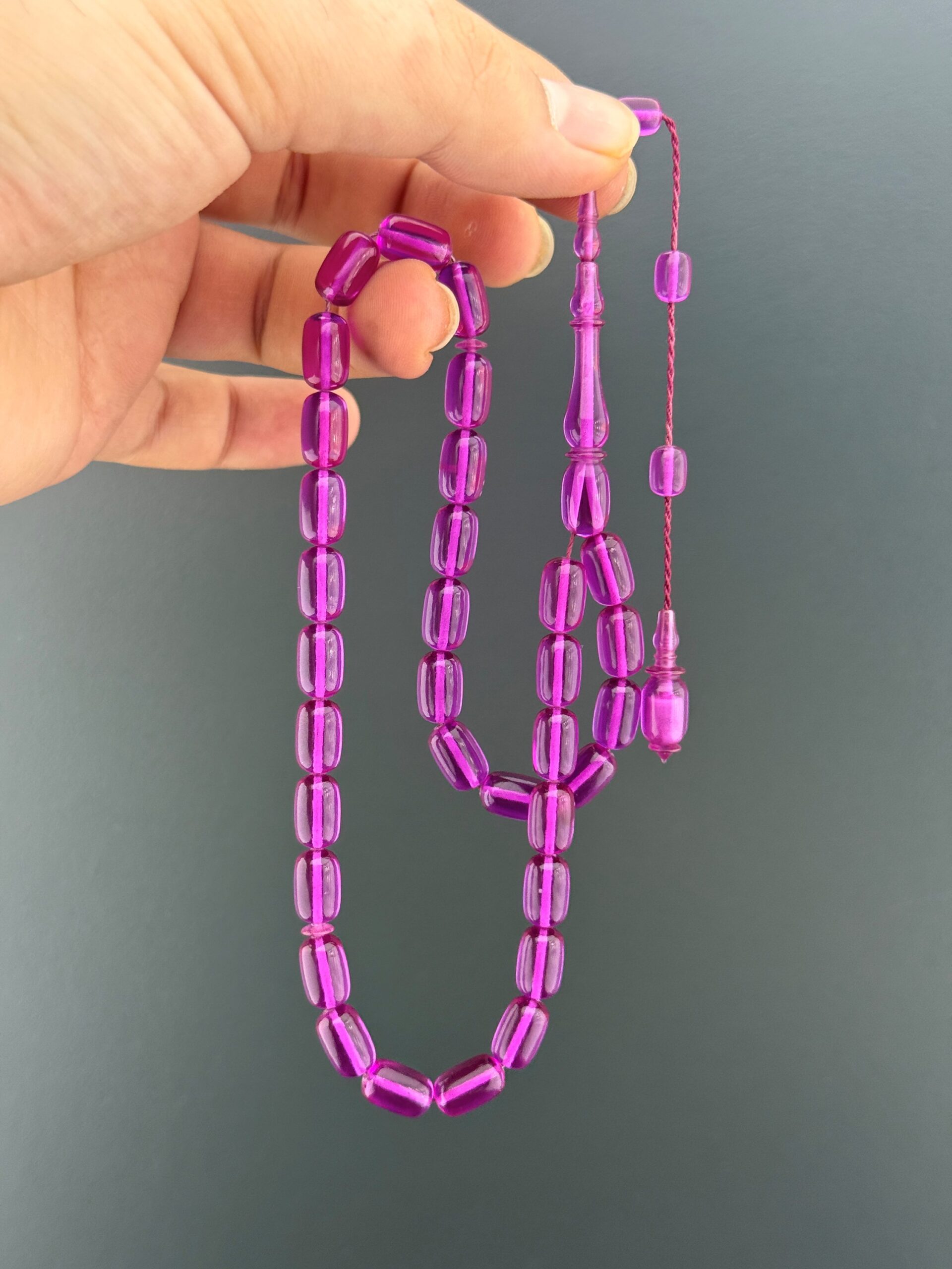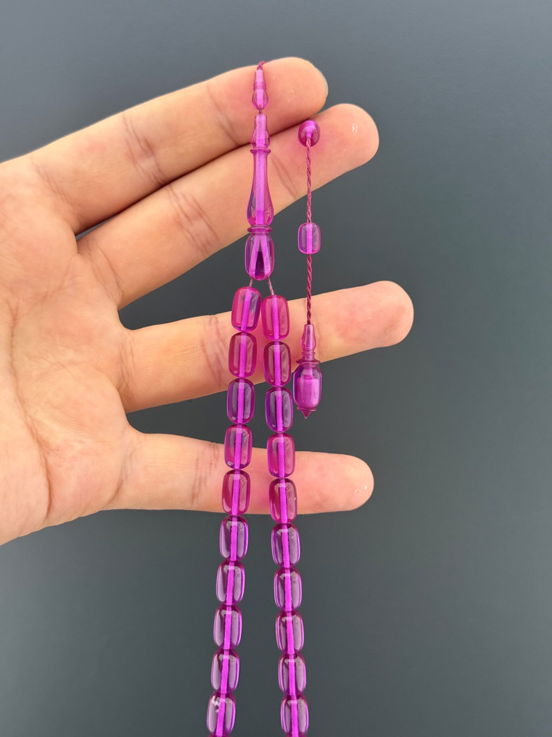 💢SELİM CANLI USTA İŞÇİLİKLİ ATEŞ KEHRİBAR TESBİH – MOR TONLAR💢 Mor rengin güçlü tonlarını taşıyan bu ateş kehribar tesbih, Selim Canlı ustanın özenli işçiliğiyle hazırlanmıştır. Kapsül kesim taneler akıcı bir ritim sunar; parlak yüzey rengi estetik biçimde vurgular. 📿 Tesbih Malzemesi: Ateş Kehribar 📿 Tane Ölçüsü: 7,25x11,5mm 📿 Tane Tipi: Kapsül Kesim 📿 Püskül: Sistem Püskül